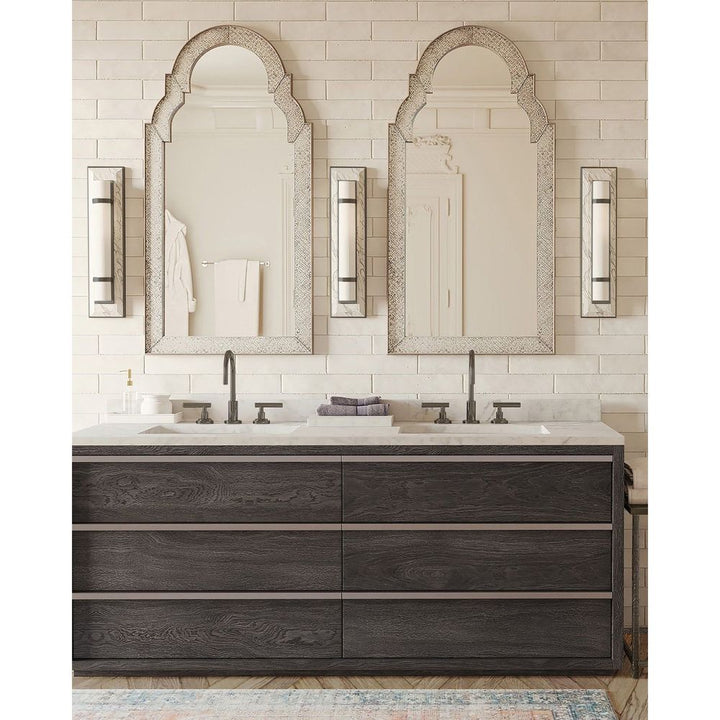 Description: A masterful mix of materials describes the Bruneau Bronze Wall Sconce. From the cloudy alabaster panel affixed to the wall plate, the metal in a warm oil-rubbed bronze finish, and the soft glow of the opaque glass shade, the layering of this design is sophisticated. The strap-like circlets that fasten the shade to the wall plate on this black wall sconce is a design detail worth noting. Part of the Bagno Collection of wall sconces designed for bathroom spaces.