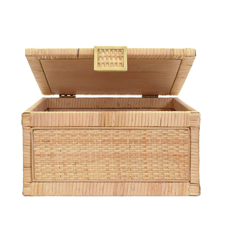 Description: LARGE NATURAL RATTAN DECORATIVE BOX WITH BRASS FOOT CAPS
