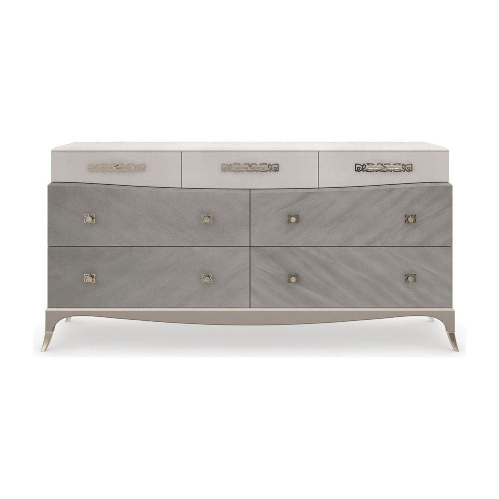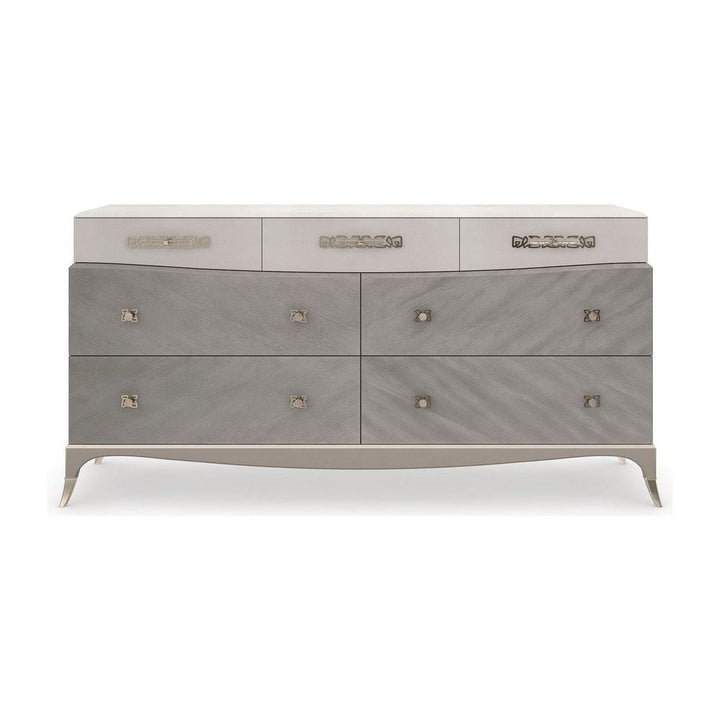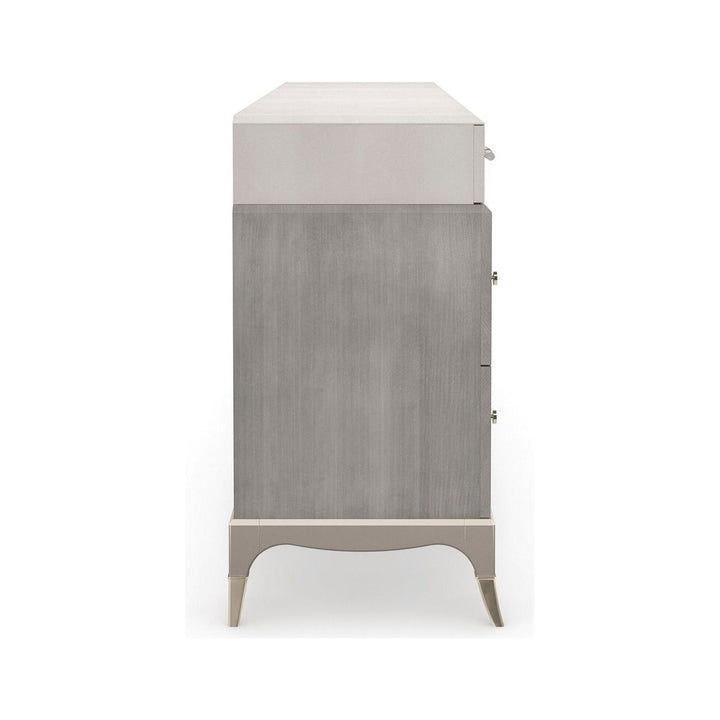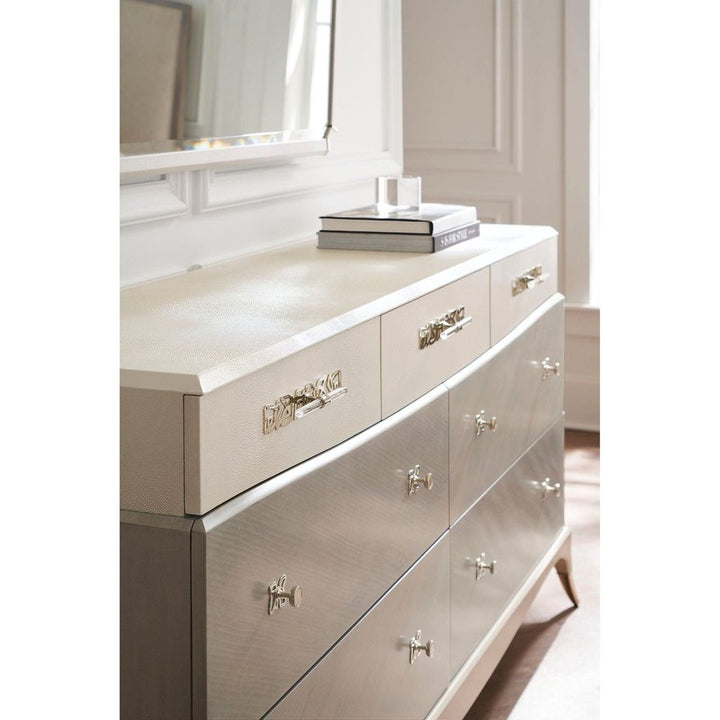 Dramatically defined by a top box wrapped in an Alabaster-painted faux shagreen, the Tempo dresser celebrates the art of adornment in contemporary form. A creamy Cappuccino finish highlights the linear grains of Coffee Platano veneers, accentuated by decorative backplates in a Whisper of Gold and custom hardware with a ceramic inset. Outwardly curving legs capped in metal ferrules emulate the soft flowing swag along the top and base railing.