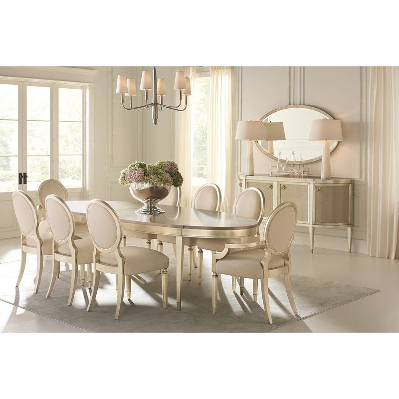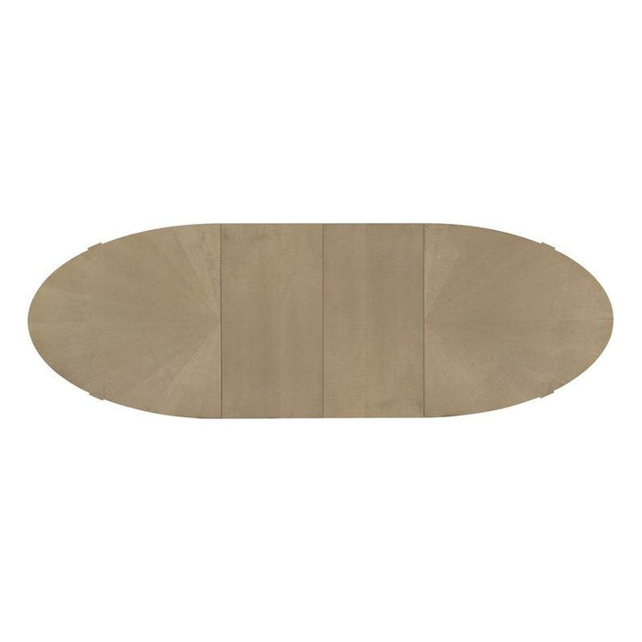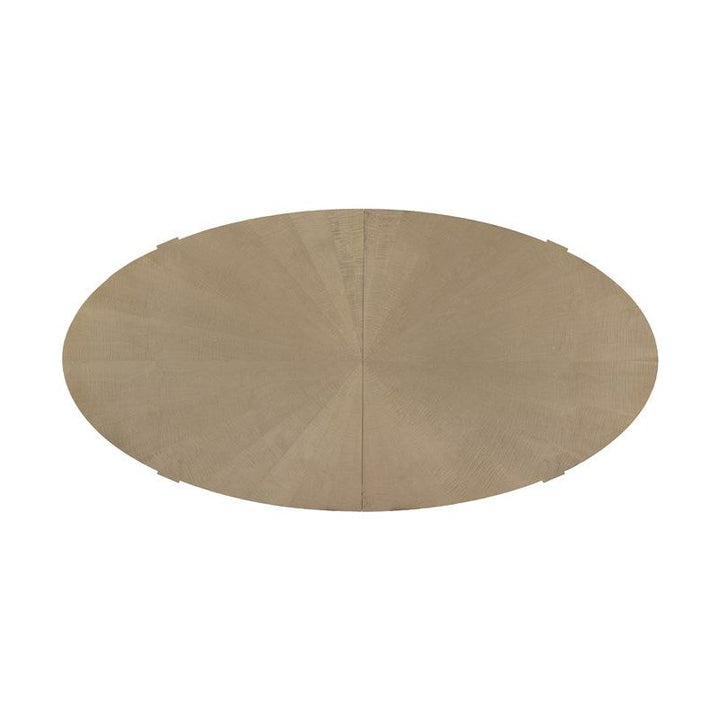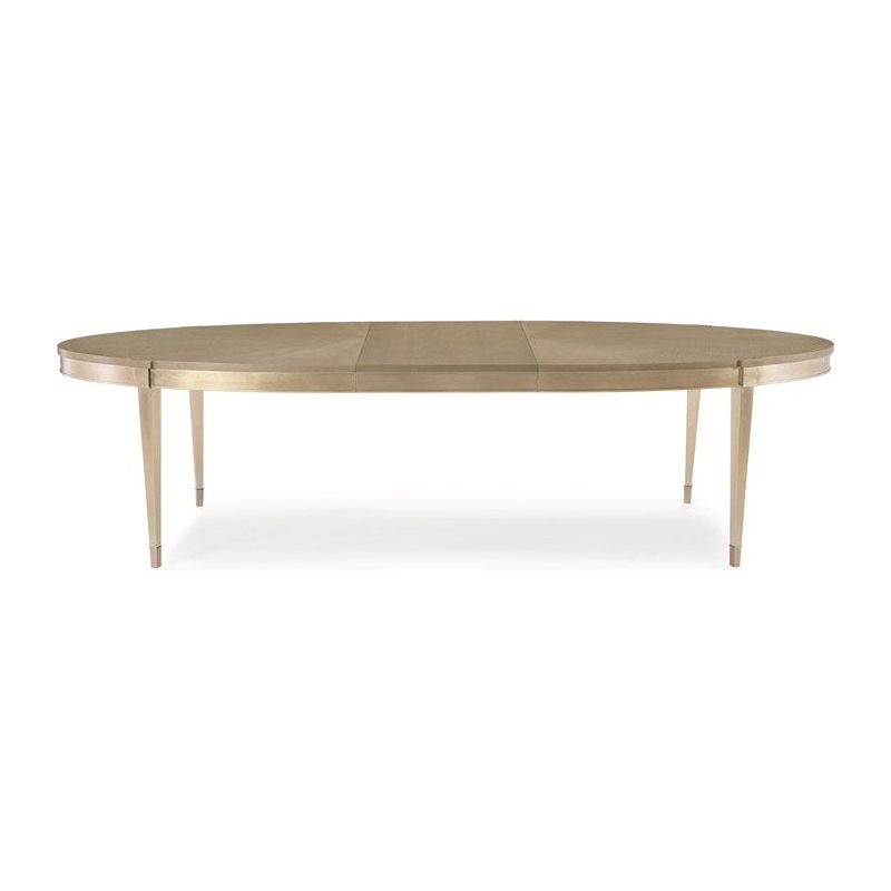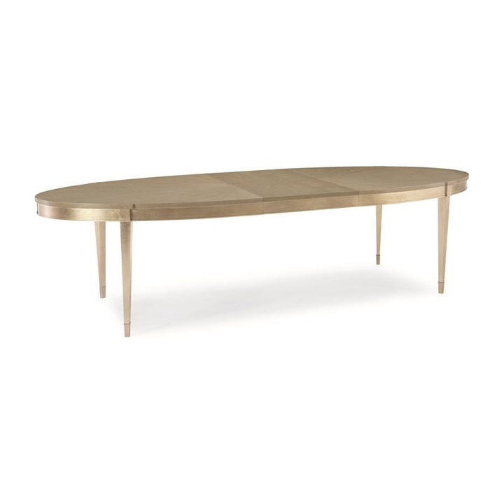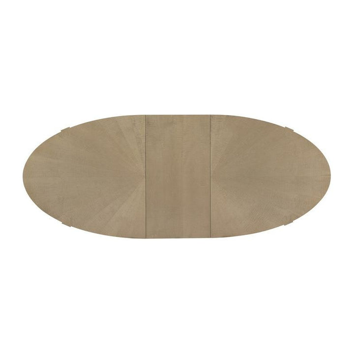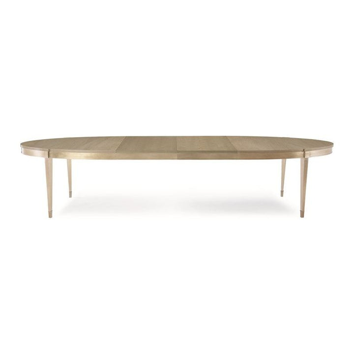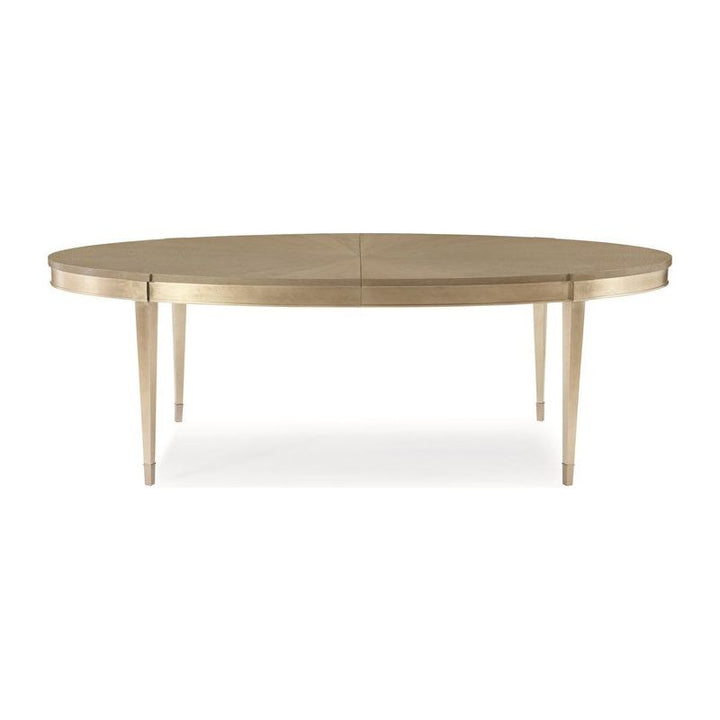 You'll be inspired to gather friends and family more often with this lovely oval dining table. Its exquisite top features radial-matched Fumed Figured Tiger Maple veneers and is finished in Smoke with Taupe Silver Leaf accents. Ensuring room for everyone, the table extends to 138 inches with its two 24 inch leaves. Metal ferrules adorn its legs for a dramatic finishing touch.