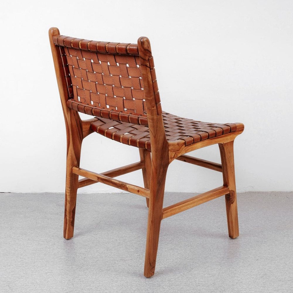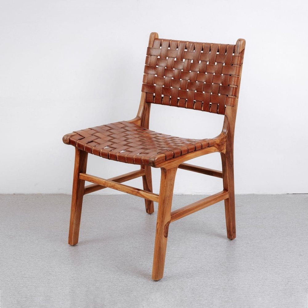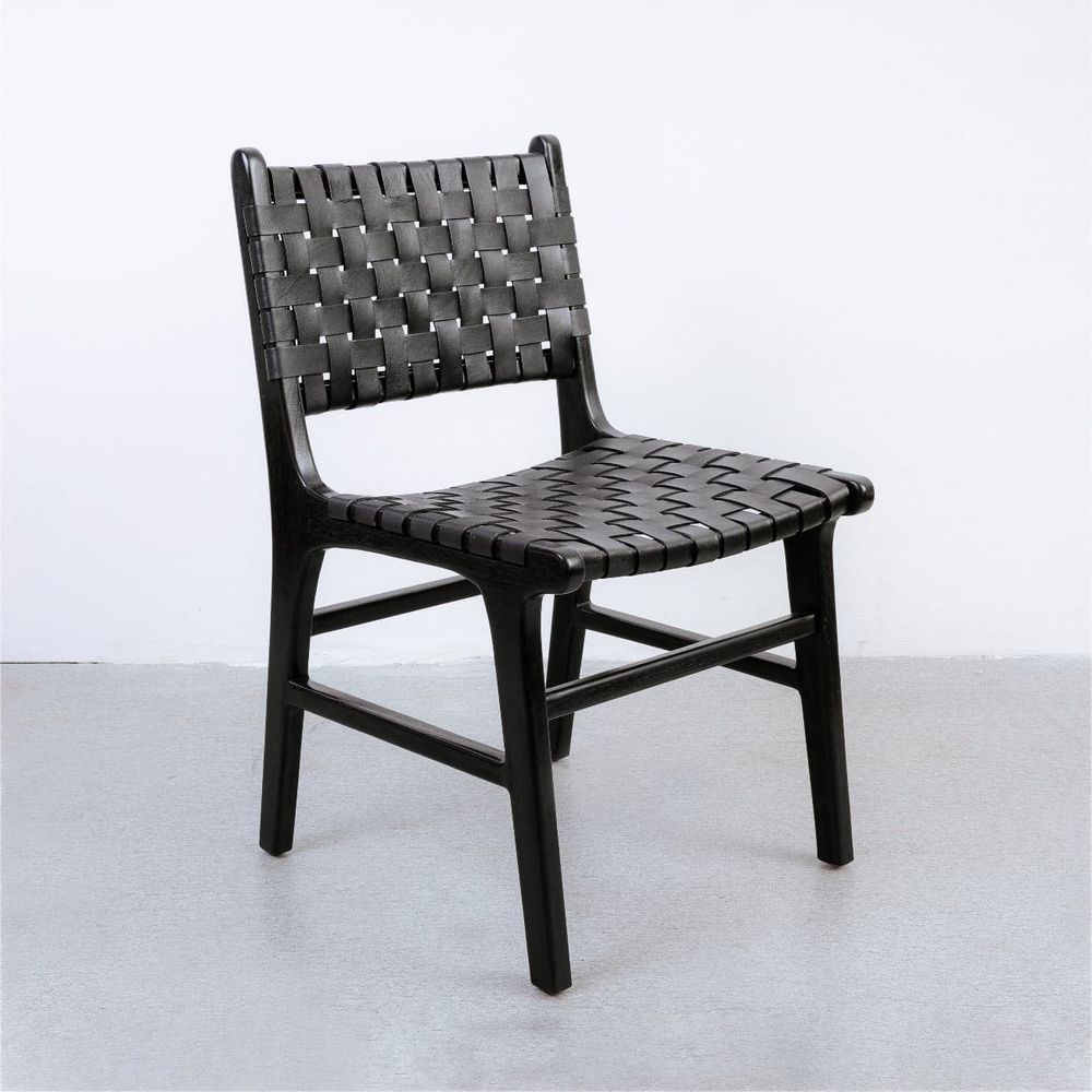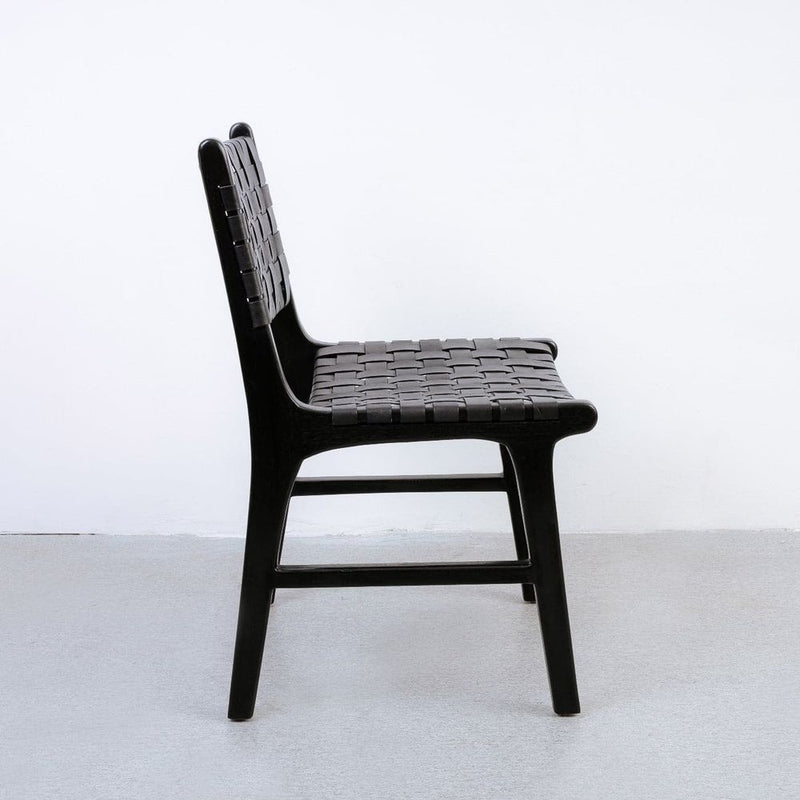This handsome side chair is the perfect addition to modern and contemporary style spaces alike. A sturdy teak frame provides ample support for the woven leather strap seat and back. The simple design allows the texture of the weaving to shine through. Available in black or brown.