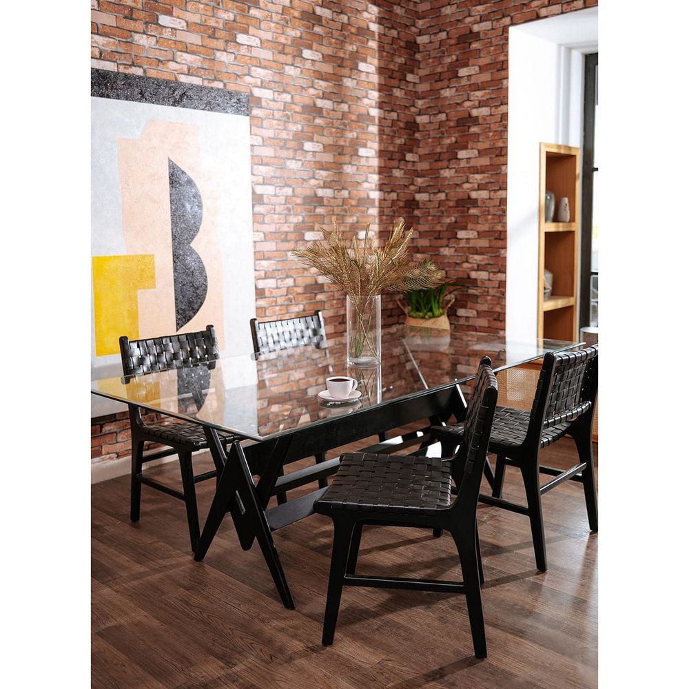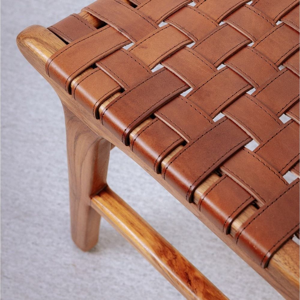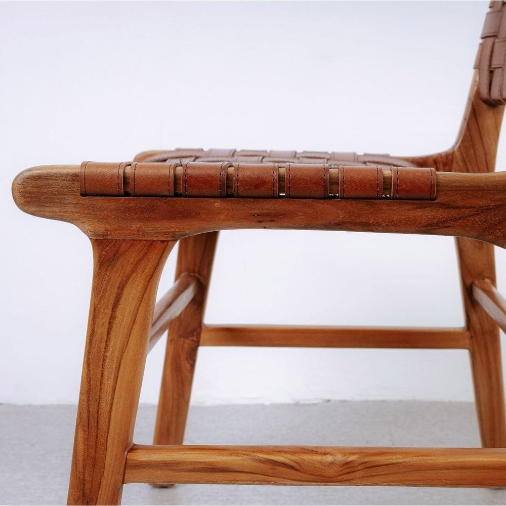 This handsome side chair is the perfect addition to modern and contemporary style spaces alike. A sturdy teak frame provides ample support for the woven leather strap seat and back. The simple design allows the texture of the weaving to shine through. Available in black or brown.