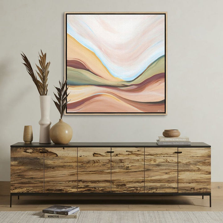 Austin-based artist Ahn Hee Strain paints as a creative outlet for mental health. She works with acrylic paint, building layers for texture and dimension. Matte canvas is float mounted within a white oak frame. Made to Order: Handmade in Austin, Texas.