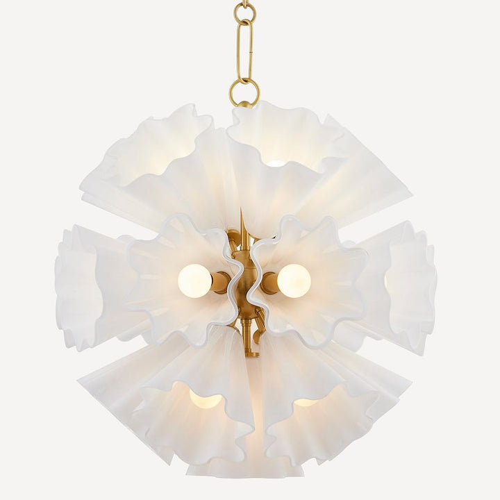 Capri is a beautifully botanical take on the sputnik silhouette. Wavy, floral-like shades of opal glossy glass sprout from a center orb to give the piece a natural, ruffled effect. This large-scale chandelier fills the entire space with a warm, tranquil glow.