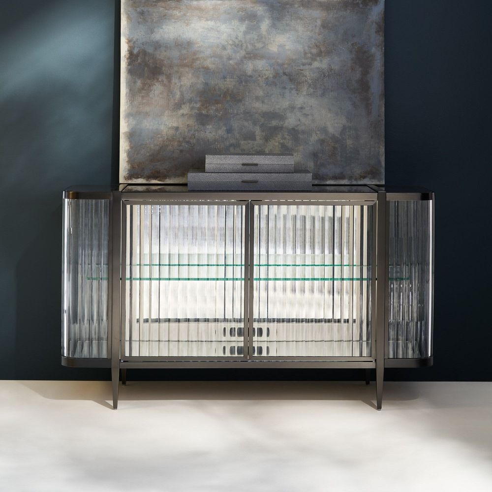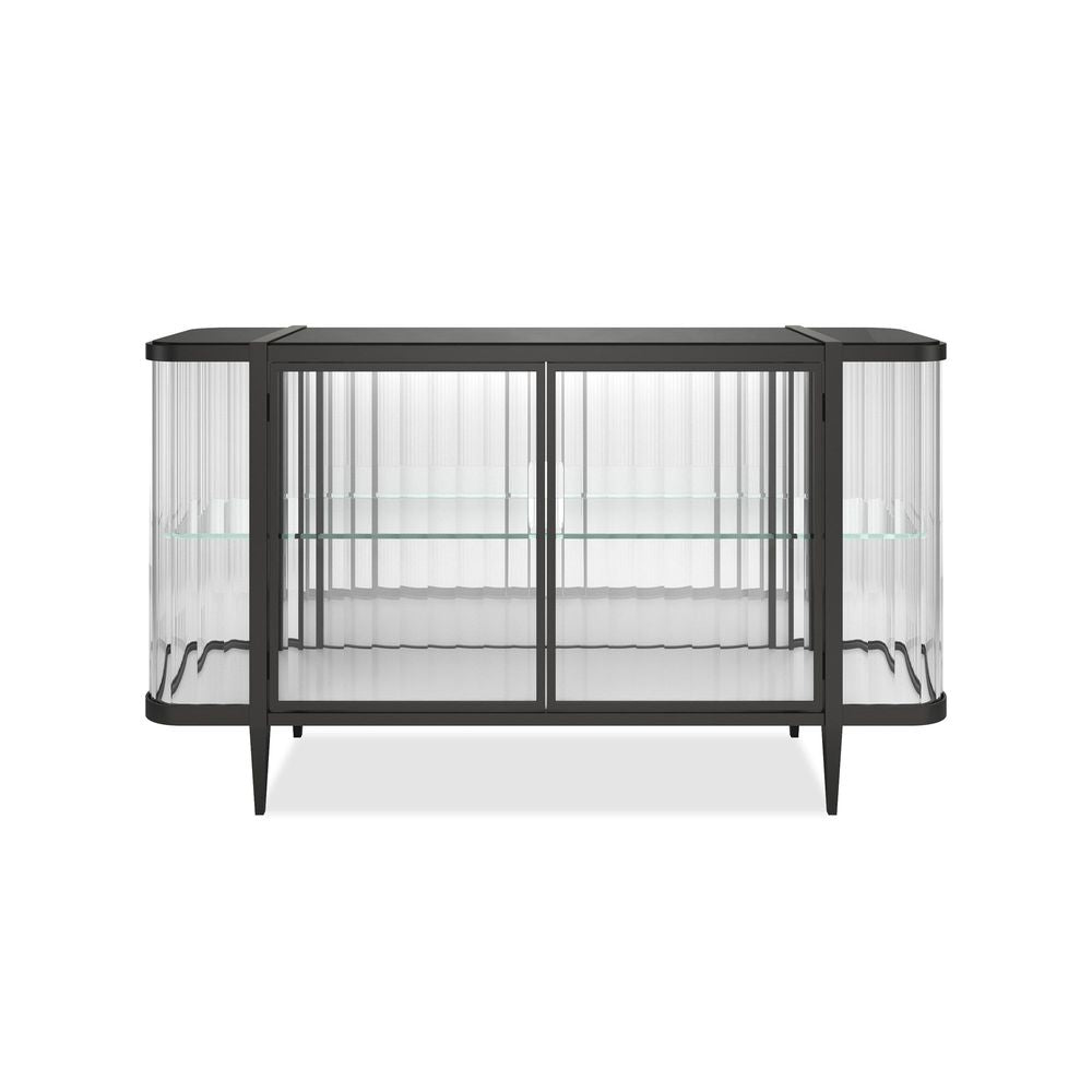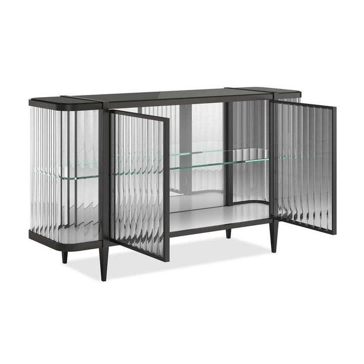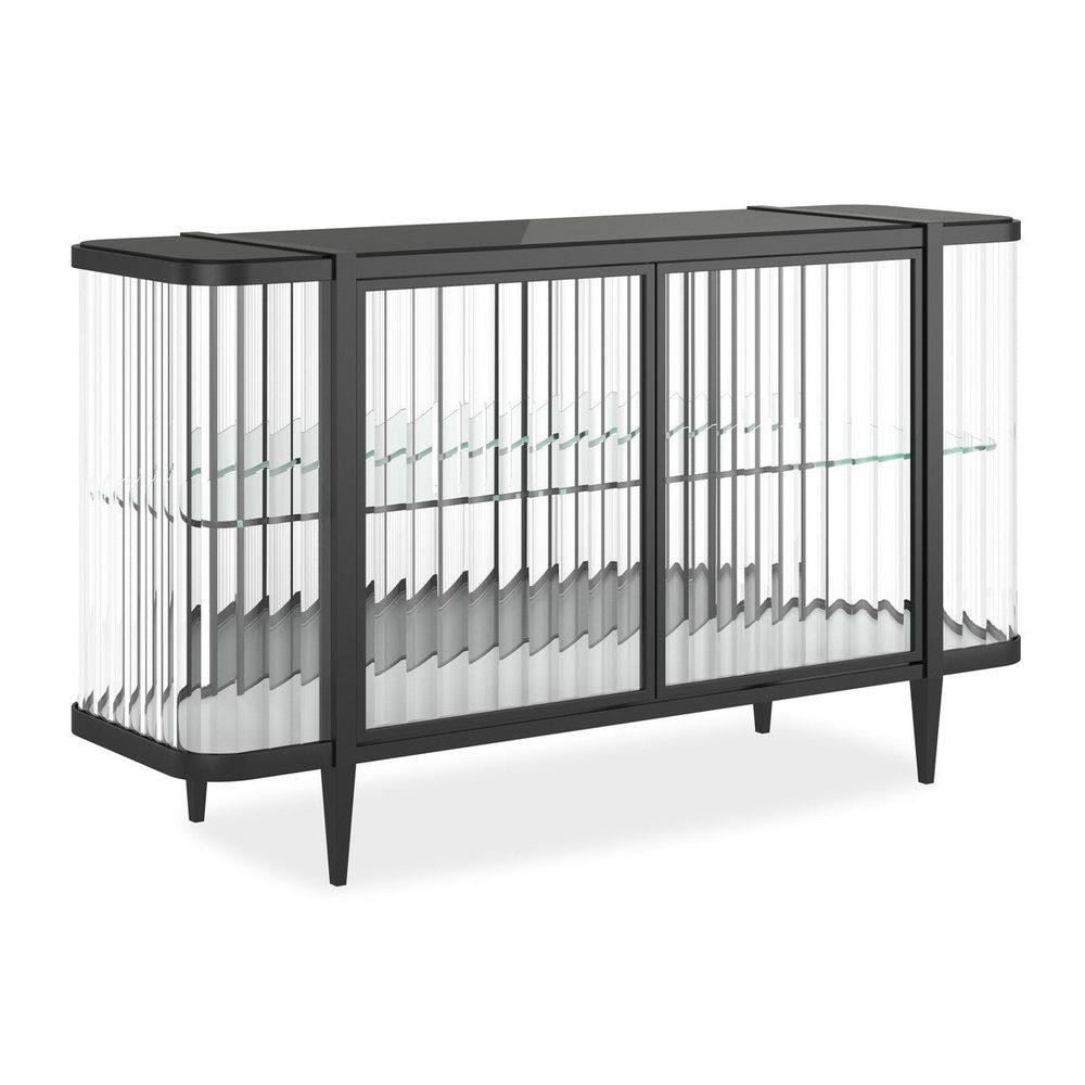 It's true, this console is so extraordinary, you can't help but Stop And Stare. It's an instant source of brightness and reflectivity that creates a natural focal point. A wavy acrylic exterior mirrors the undulating patterns of sand and sea while its top adds another layer of organic splendor. The mirrored interior back and bottom panels are designed to reflect light as it pours in from every angle as well as mirror the beauty of the treasures you display. Glass shelves ensure unobstructed views as do its touch-latch doors with concealed hinges. A Brushed Deep Bronze outlines its rounded silhouette and four tapered feet, imparting the overall luxe feeling of a diamond in a platinum setting.