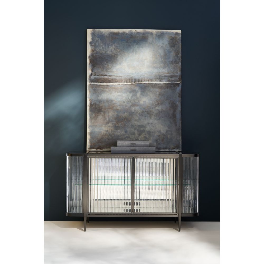 Features: Top is back painted glass in Soft Silver Paint.Case frame in Whisper of Gold.Doors and end panels in cast wavy acrylic.Two touch latch doors.Interior features mirrored back and bottom panels with glass shelves.LED light strip.Cord access.Interior in Soft Silver Paint.