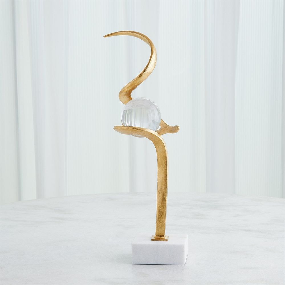 Description: Carefully crafted from cast iron with a hand-applied gold or silver leaf finish, The Captured Sphere Sculpture elegantly rests on a white marble or black granite base, showcasing a captivating crystal sphere. Note: Avoid placing the sculpture in direct sunlight, as the crystal sphere may magnify the sun's light, posing a potential fire hazard.