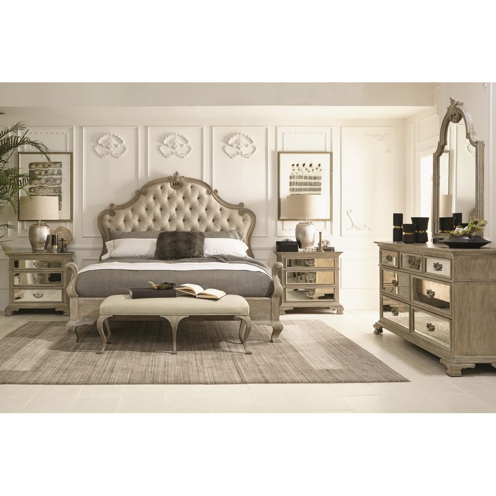 Description: The Carmelia panel bed strikes the perfect balance between classic ornamentation and relaxed comfort. Artistic touches such as cabriole legs and an acanthus leaf carving show European influence, but they are presented in a natural Weathered Sand finish with a subtle whitewashed effect. A neutral, textural weave on the upholstered headboard is casual and soothing, while button tufting is traditional and refined. With its rustic aesthetic, this piece offers depth, movement and form without being overly formal.