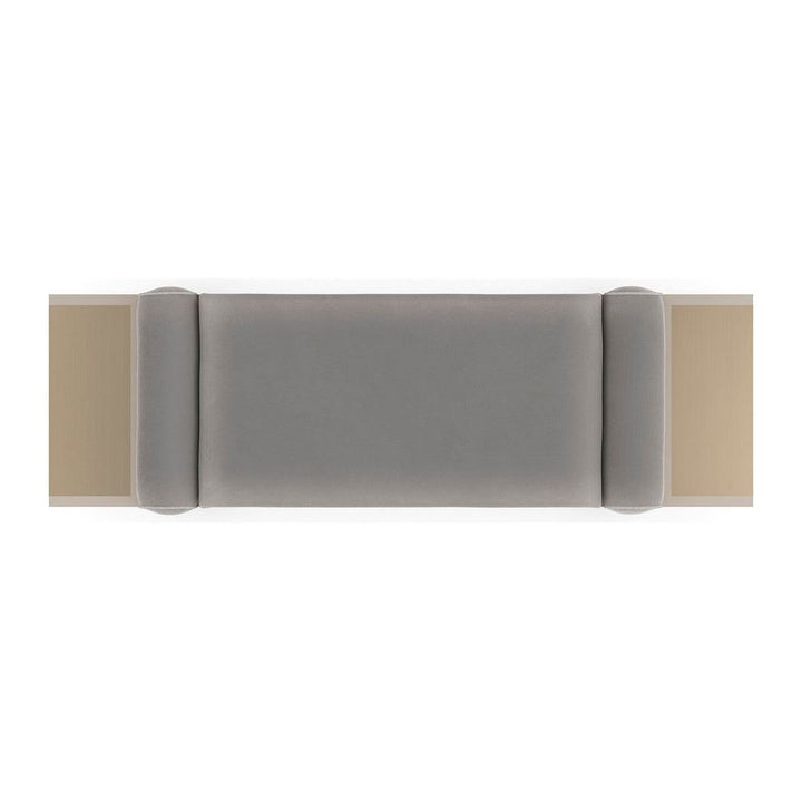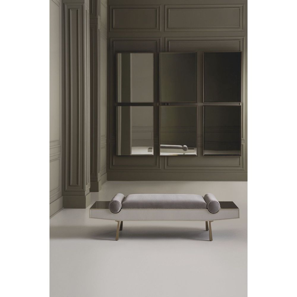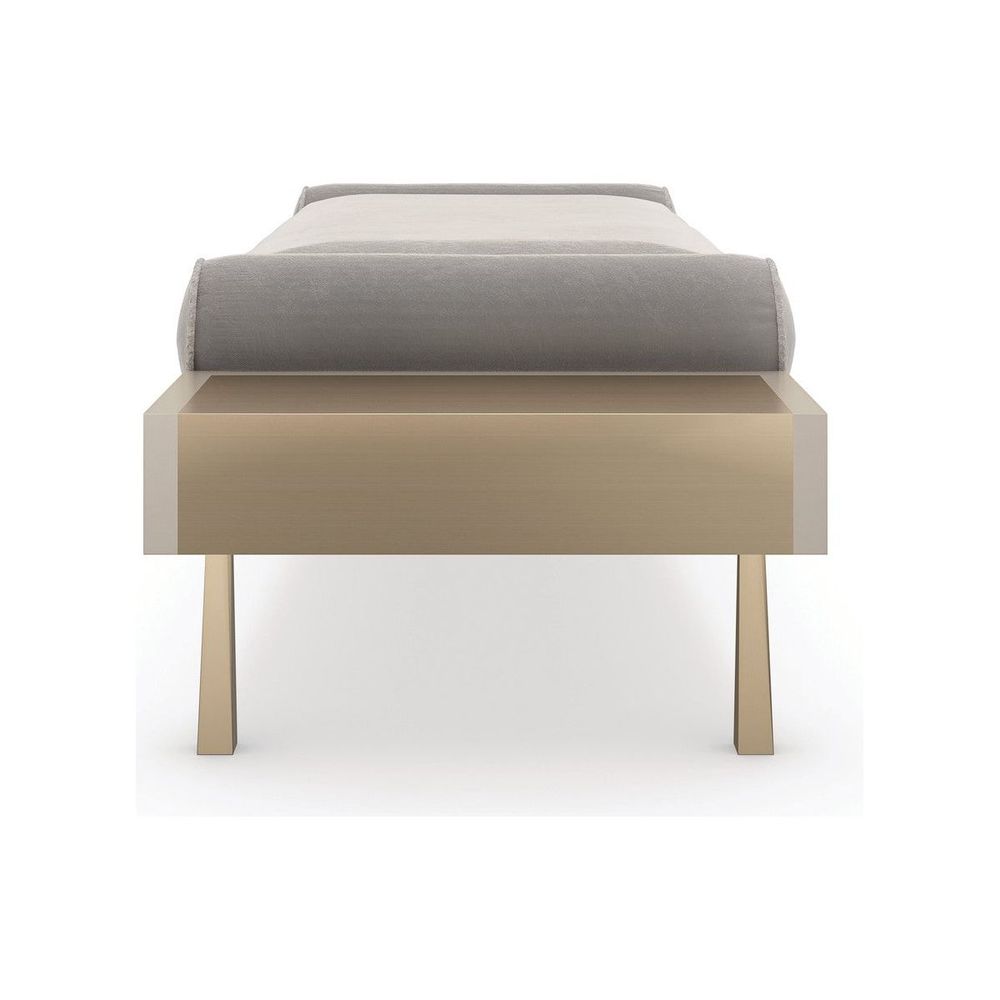Modern yet elegant in a luxe material mix, this streamlined bench is well-scaled for end-of-bed or an entryway. A reeded apron in a creamy Almond Milk finish brings a sense of rhythm and striking pattern, complemented by a soft gray mohair fabric with a hint of green. Its sleek design featured recessed bolster pillows and opposing metal wings, perfect for placing a book or decorative object. Brushed Gold wraps the ends for a chic finishing touch.