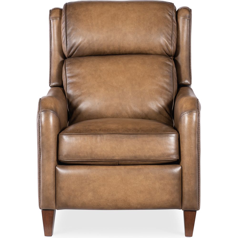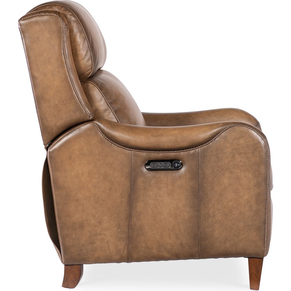 Description: Swanky and stylish, the Carrington Power Recliner with Power Headrest and USB Port has a bustle style back, sloped arms and tapered wood legs in a dark finish. It is covered in a semi-aniline top grain luxurious leather called Nature.