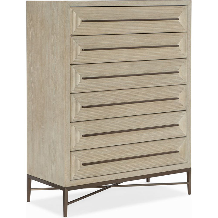 Svelte and sophisticated in a serene soft finish on Oak Veneers with tactile reeded drawer fronts, the Cascade Chest with six self-closing drawers is a stylish statement piece brimming with storage. The Terrain finish on oak veneers is dry-brushed for a casual appeal, and accented by champagne-colored bar pull hardware and slender metal legs joined by an X-stretcher. The top drawer has a removable gray liner and the bottom drawer is cedar-lined. Designed to interject a sense of calm and tranquility into interior spaces, the Cascade Collection creates an elegant - yet livable - retreat from our modern day, fast-paced lifestyles. Characterized by its light and airy neutral color palette and use of mixed materials including oak, lacquered burlap, metal accents and champagne-tone hardware, the collection's modern styling can easily find its way into a variety of interiors across the country. As soothing as water falling from a steep rocky slope, the Cascade Collection was designed to spark Zen, tranquility and calmness in any living space.