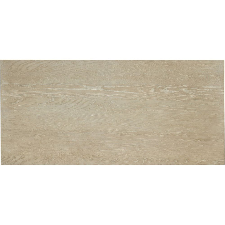 - Finish:Terrain: a soft, taupe finish on oak veneers. Distressing includes dry brushing. Champagne colored bar pull hardware and metal base.