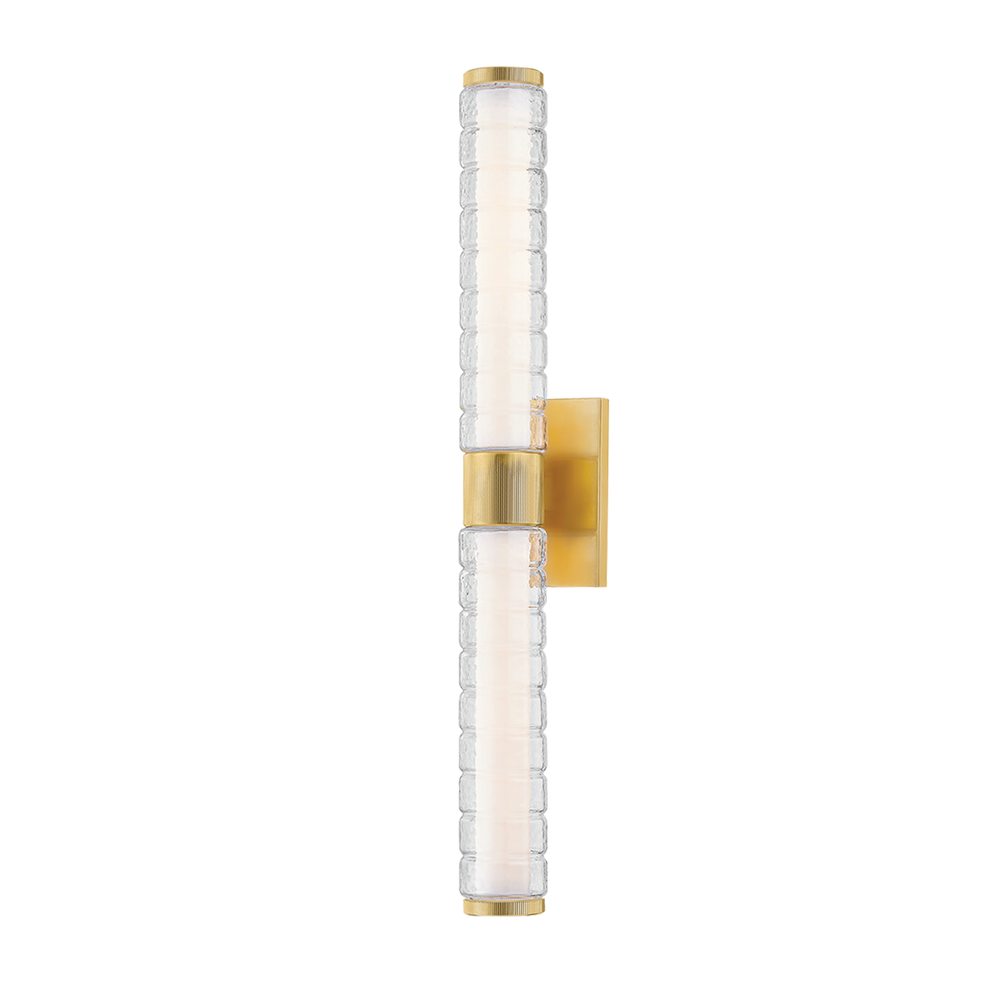 Description: Drawing inspiration from modernized Art Deco interiors, Castor features a construction of thick glass tubes, ridged to resemble stacked rings. The subtle chill marks of the glass create a contemporary, icy glow when lit by the integrated LED. An Aged Brass finish adds warmth to the frame. Whether in its 1 or 2-light form, Castor illuminates spaces with a lively, bubbly charm.