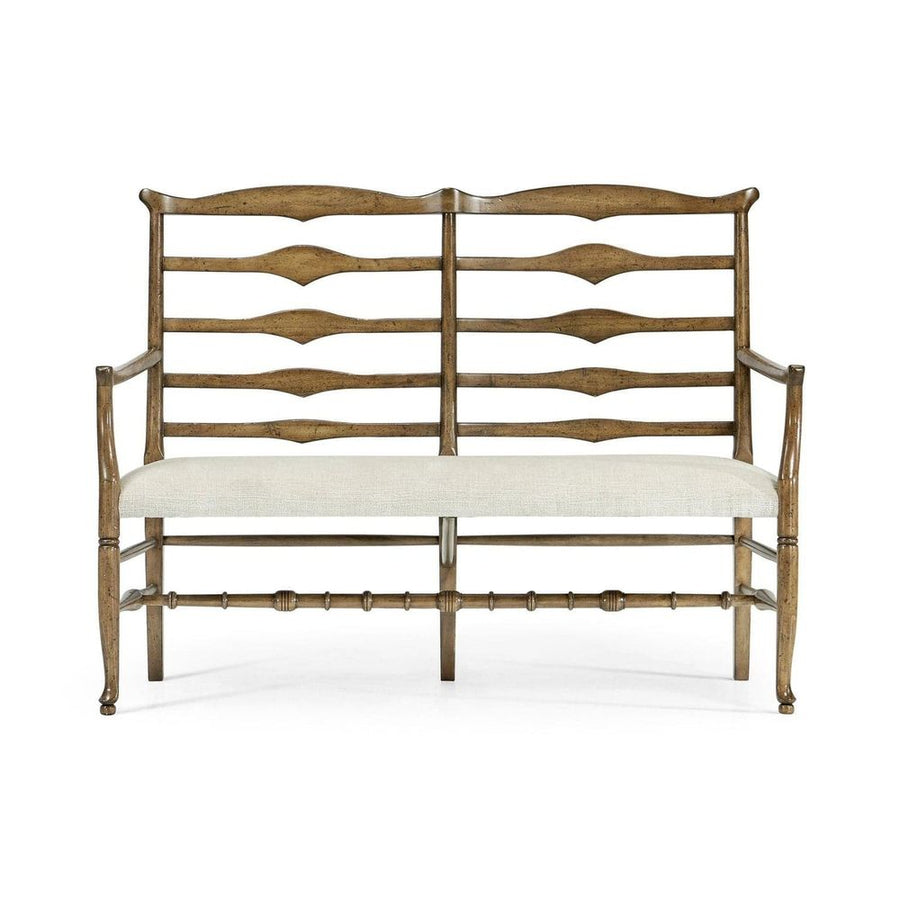 Country style DarkDriftwood, MediumDriftwood & Rushed Seat,MediumDriftwood, Whitewash Driftwood,Walnutladder back two seat bench with shaped back rail, graduated ladder slats with triangular shaping in the centre and an upholstered seat. Turned legs and stretchers beneath.