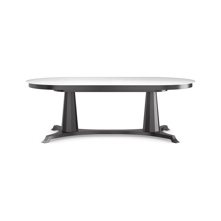 Simply elegant with a restrained use of embellishment, this oval-shaped dining table makes a surprisingly striking statement. With an opaque effect reminiscent of milk glass, its polished, tempered glass top is contrasted by an Almost Black double pedestal base with faceted columns for a hint of traditionalism. Perfect for entertaining and celebrating special occasions, it comfortably seats 12 when fully extended.