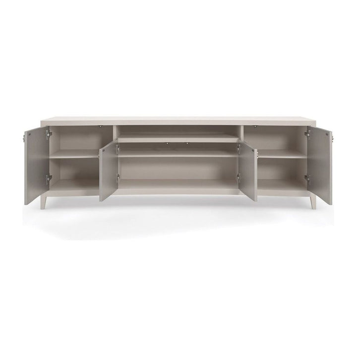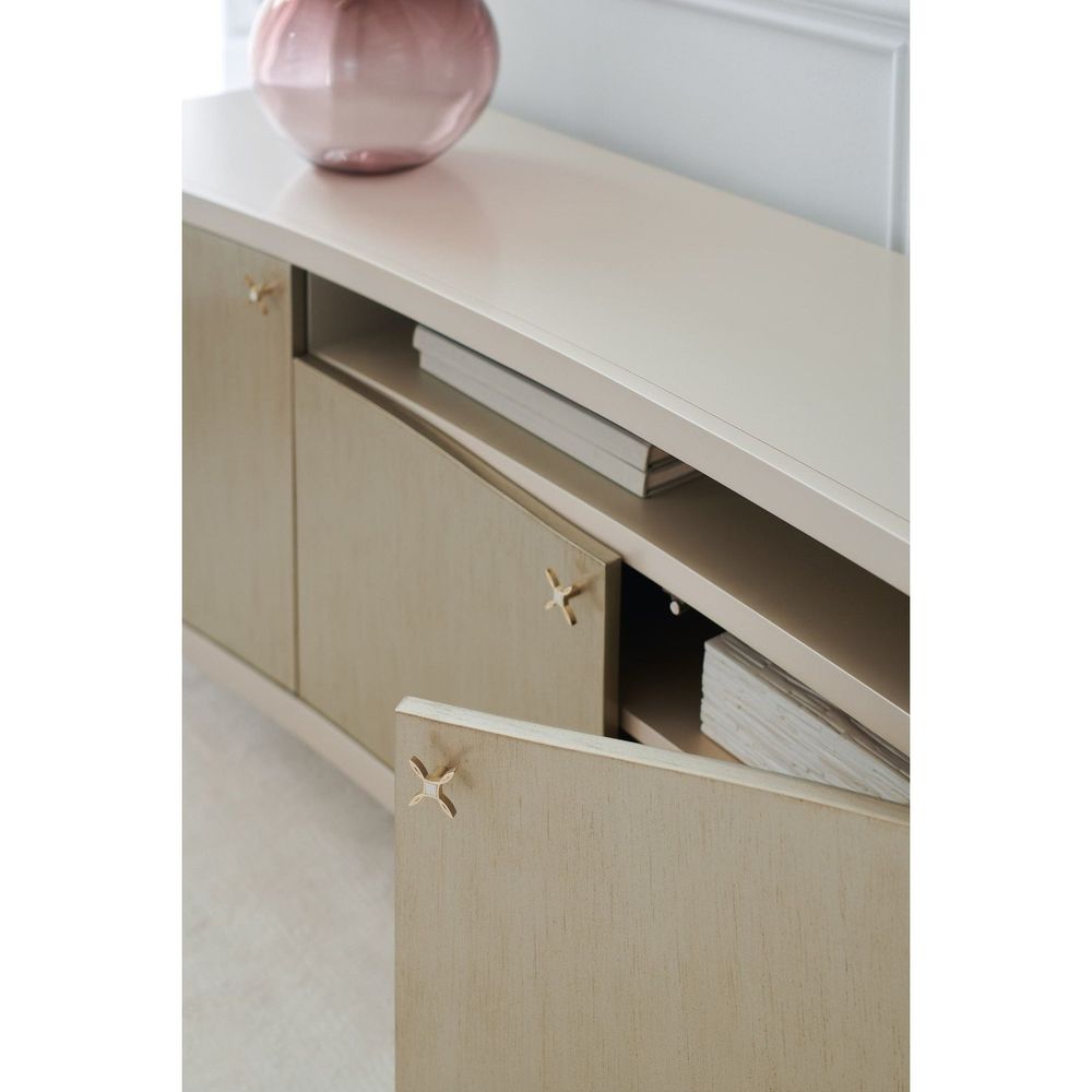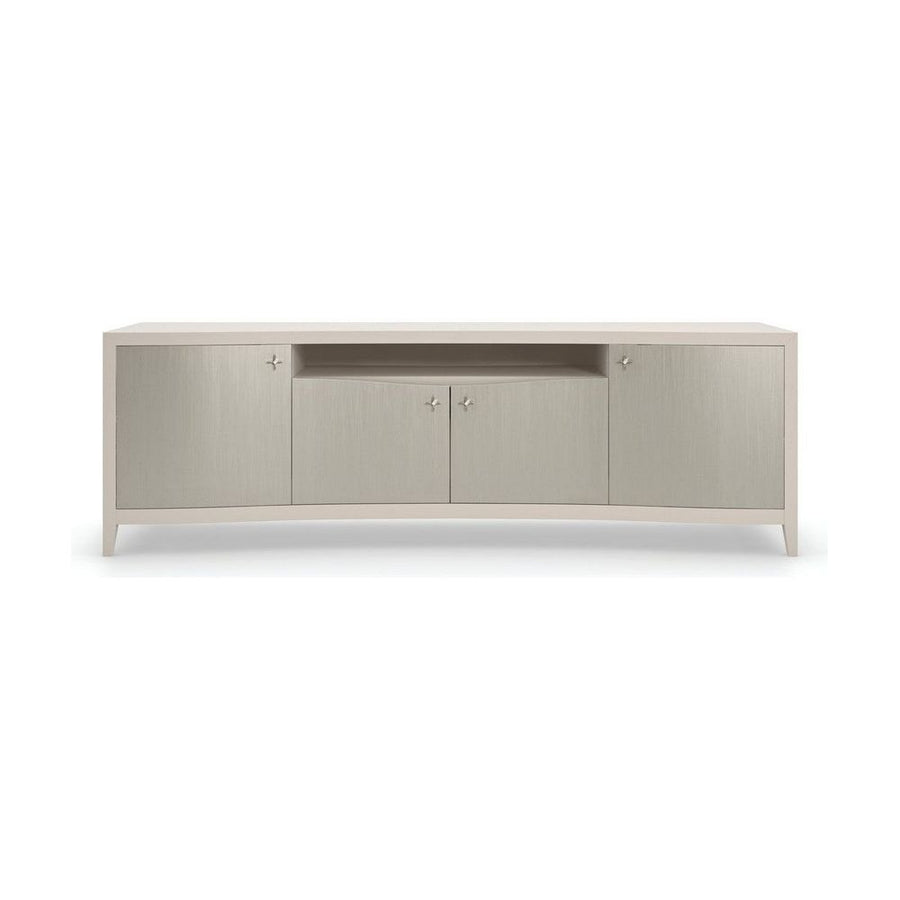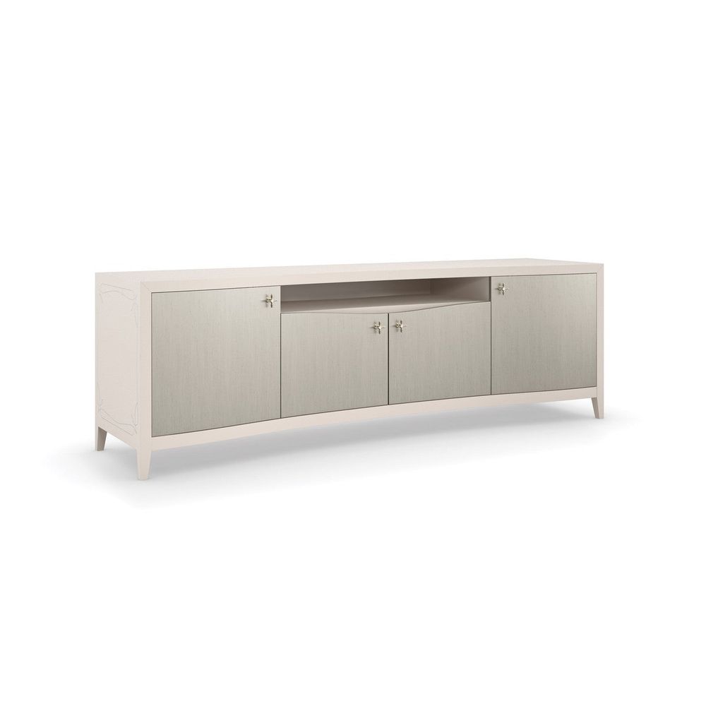 With subtle curves complemented by soft silver tones, this media console makes a charming addition to any interior. A matte pearl finish gives light to the natural beauty of maple veneer, artfully accentuated by painted door fronts in Silver Charm. Adding a note of distinction: end panels screen printed with a pinstripe design and jewelry-like hardware in a stylized star shape. Features abundant storage potential with adjustable shelves.