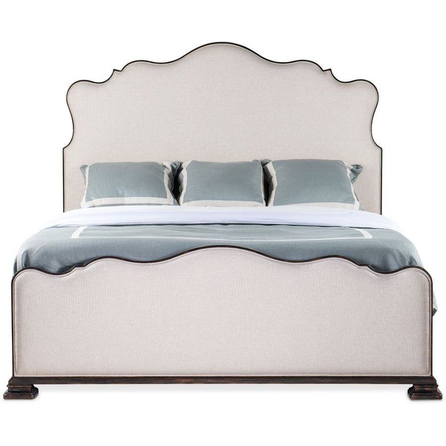 Description: The stunning Charleston California King Upholstered Bed marries a traditional soul with a hint of cosmopolitan chic. Contrasting the rich Black Cherry heirloom finish on the wood trim, side panels and feet with the Chateau Linen upholstery on the scalloped-edge headboard and footboard, the bed is crafted of Cherry Veneers and fabric.