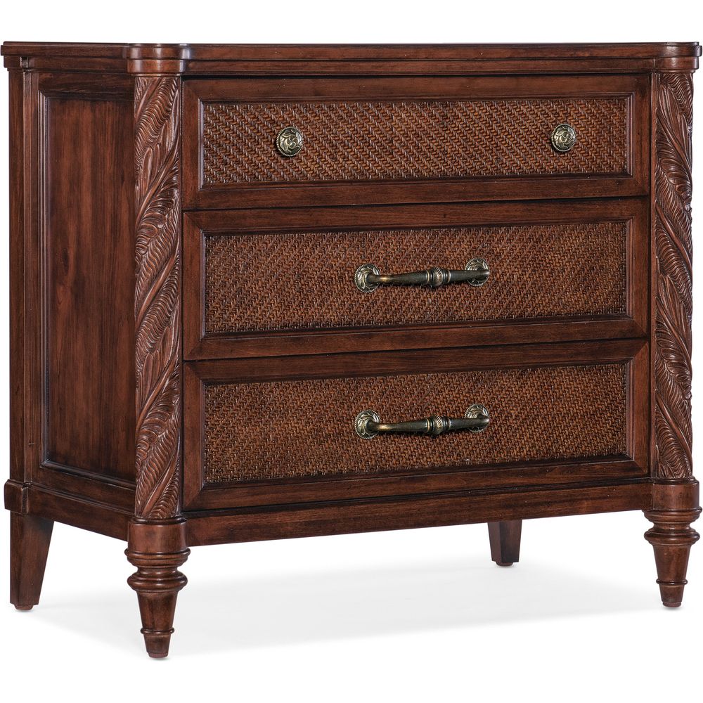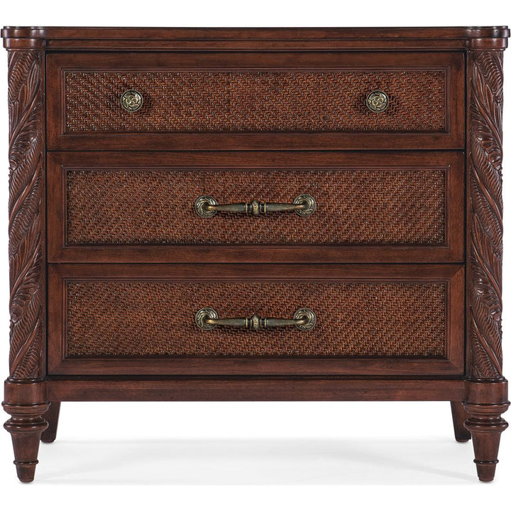 Description: Taking inspiration from the tropical craftsmanship of botanical carving and woven cane accents of classic British and Dutch Colonial design, the Charleston Nightstand is crafted of Cherry and Walnut Veneers, Walnut Inlay and Cane with a Solid Wood top. All 3 self-closing drawers have cane insets, and the two front posts are adorned with botanical carving. There are two USB ports and chargers on the back, along with a cord clip. The nightstand is finished in Maraschino Cherry using natural grain Cherry Veneers showcasing a dramatic cathedral structure with naturally occurring knots to deliver a rich warm finish and a smooth sophisticated aesthetic. The round knob and bar pull hardware has an antique bronze finish.