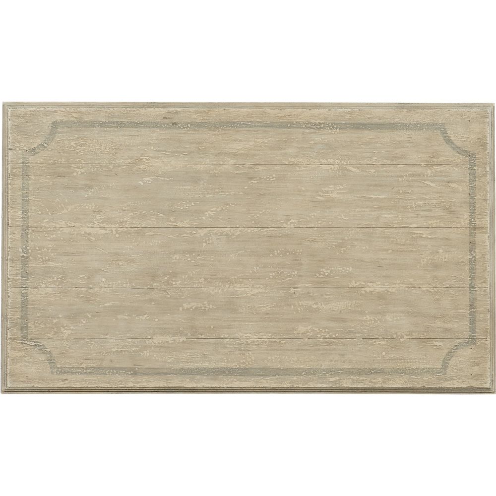 Elegant vintage turned spindle legs in black contrast with a Flaky White-finished top for a look that is farmhouse fresh and inviting. The practical rectangle shape makes this table livable and functional. Crafted of Poplar and Hardwood Solids with Maple Veneers. Inspired by the small farmhouses that dot the French and Italian countryside and have been in the hands of the same family for generations, Hooker Furniture introduces the rustic Ciao Bella Collection. The whole home collection is an eclectic mix of European farmhouse pieces that have the appearance of furniture that has been refinished multiple times as it has passed through the generations. Ciao Bella includes bedroom, dining room, occasional, home office and accent furniture, and features a finish called Timeworn Gray that accentuates the historical nature of European farmhouses - many of which include a variety of furniture styles that have been added by each generation of owners.