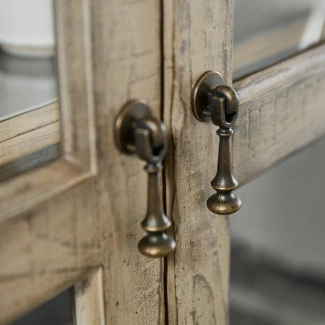 - Features: Two doors, Framed and beveled glass, Two adjustable wood-framed glass shelves, One fixed wood-framed glass shelf