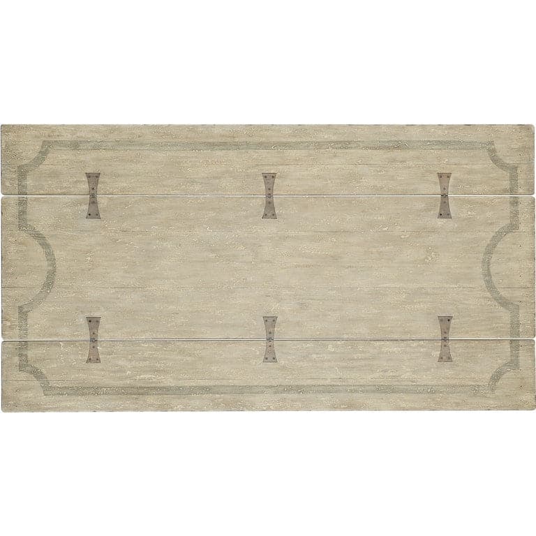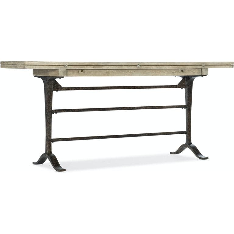 With a chic French industrial look, you can use this metal and wood console as a sofa table, desk and even for extra dining when guests arrive. Two leaves on either side flip open, and pull-out supports brace the leaves when open. The soft Flaky White finish over Poplar and Hardwood Solids with Maple Veneers contrasts with the Aged Iron base. Inspired by the small farmhouses that dot the French and Italian countryside and have been in the hands of the same family for generations, Hooker Furniture introduces the rustic Ciao Bella Collection. The whole home collection is an eclectic mix of European farmhouse pieces that have the appearance of furniture that has been refinished multiple times as it has passed through the generations. Ciao Bella includes bedroom, dining room, occasional, home office and accent furniture, and features a finish called Timeworn Gray that accentuates the historical nature of European farmhouses - many of which include a variety of furniture styles that have been added by each generation of owners.