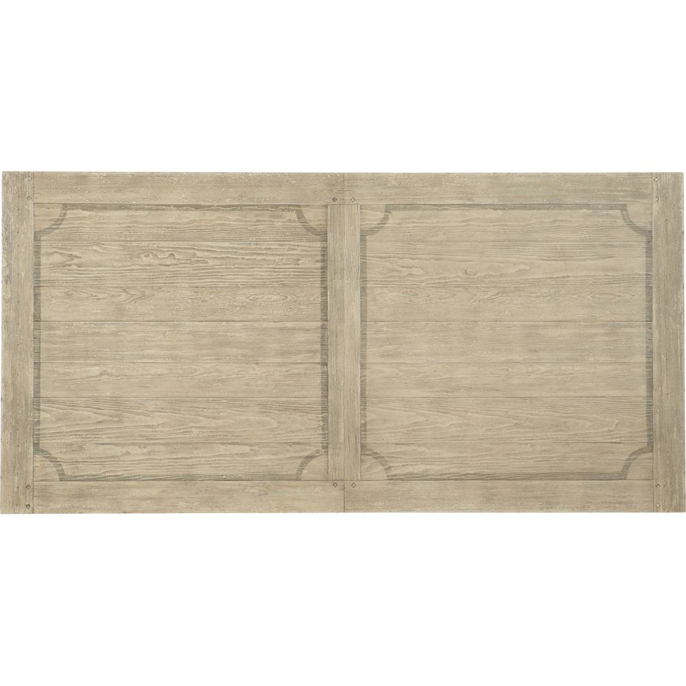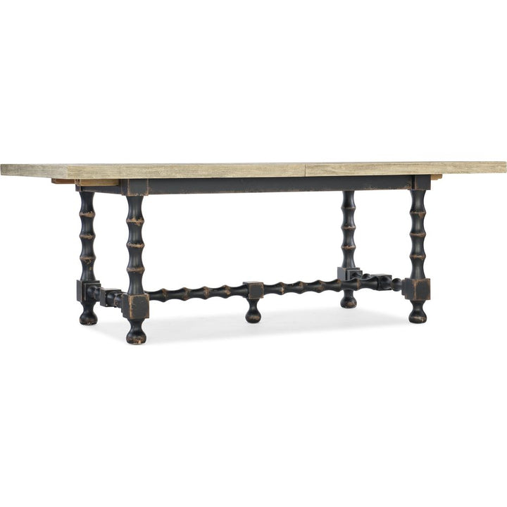 Be transported to a romantic, rustic Italian farmhouse as you dine around the Ciao Bella 84-inch Trestle Table. The base has turned legs and an exquisite black finish with hand-chiseling and wire brushing, and contrasts with a Flaky White top. The two 18-inch leaves extend the table to 120 inches, accommodating up to 10 guests. Beautifully crafted of Poplar Hardwood Solids with Pine Veneers. Inspired by the small farmhouses that dot the French and Italian countryside and have been in the hands of the same family for generations, Hooker Furniture introduces the rustic Ciao Bella Collection. The whole home collection is an eclectic mix of European farmhouse pieces that have the appearance of furniture that has been refinished multiple times as it has passed through the generations. Ciao Bella includes bedroom, dining room, occasional, home office and accent furniture, and features a finish called Timeworn Gray that accentuates the historical nature of European farmhouses - many of which include a variety of furniture styles that have been added by each generation of owners.