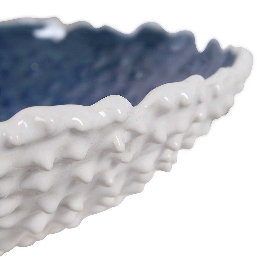 White ceramic bowl with heavy exterior texture and a bright blue interior glaze.
