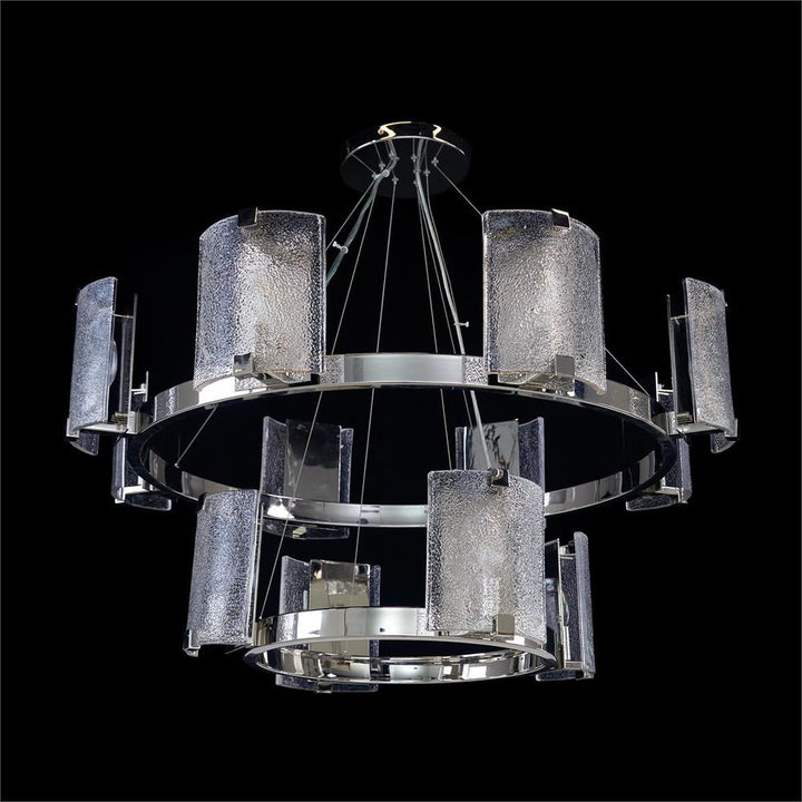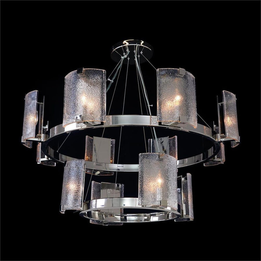 The Clarion Twelve-Light Chandelier is a gorgeous lighting fixture with a subtle, yet sophisticated design. A two-tiered ringed metal frame in a Polished Nickel finish supports twelve lights, beautifully diffused through curved shades of textured clear glass. The piece is suspended from a round canopy and hung from a chain for a sleek, transitional look.