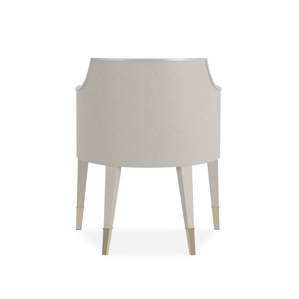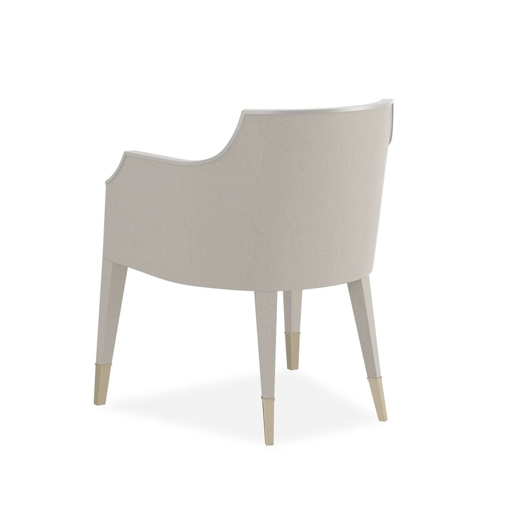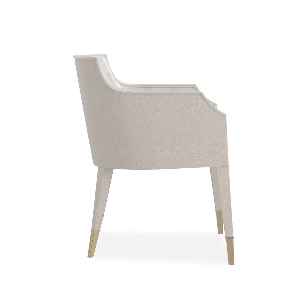 Features: Chair outside back and outside arm in Ivory Painted Faux Shagreen.Exposed wood in Ivory.Inside back, inside arm and seat upholstered in fabric.Metal ferrules in Whisper of Gold.Chair is packaged and sold 1 per carton.