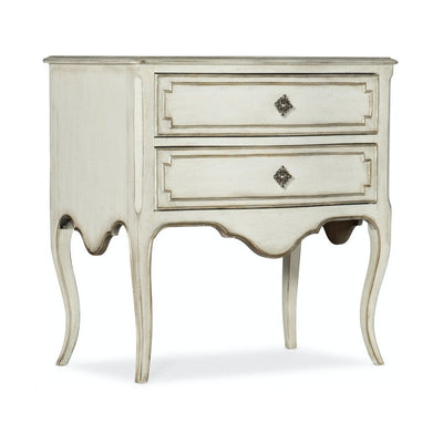 .With shapely legs up to hero, the Coco En Blanc Nightstand is a timeless treasure of delightful design that will help you create a serene bedroom where the stresses of the day melt away. The creamy white finish, shaped apron on the front and sides and cabriole legs create a masterpiece of style. Two drawers. Channeling jet setting socialites from the golden age of Hollywood as its muse, Hooker Furniture is set to launches a major expansion to its popular Sanctuary collection. The bedroom, dining room, occasional and home office pieces are grouped into three unique new personas, each of which embody the influences of the iconic starlets whom left impressions of glamour, charm and class on American pop culture. From bold and dramatic to soft and romantic to a statement-making eclectic lifestyle, the three personas - Collette, Anastasie and Diamant - effortlessly bring to life a well-traveled socialite who has curated a collection of home furnishings in her metropolitan home that tell the story of her travels across the globe. Anastasie offers a softer, romantic look with its creamy white finish that is accented with champagne and silver tipping. Several historical reproduction styled pieces in a two-tone finish are intermingled throughout, giving the group a bit of a traditional European cottage style. Additional design details include table tops with intricate quatrefoil veneer patterns crafted with oak and a mix of unique walnut inlay, carved chairs with acanthus leaf and scrollwork detailing and champagne tipped eglomise.