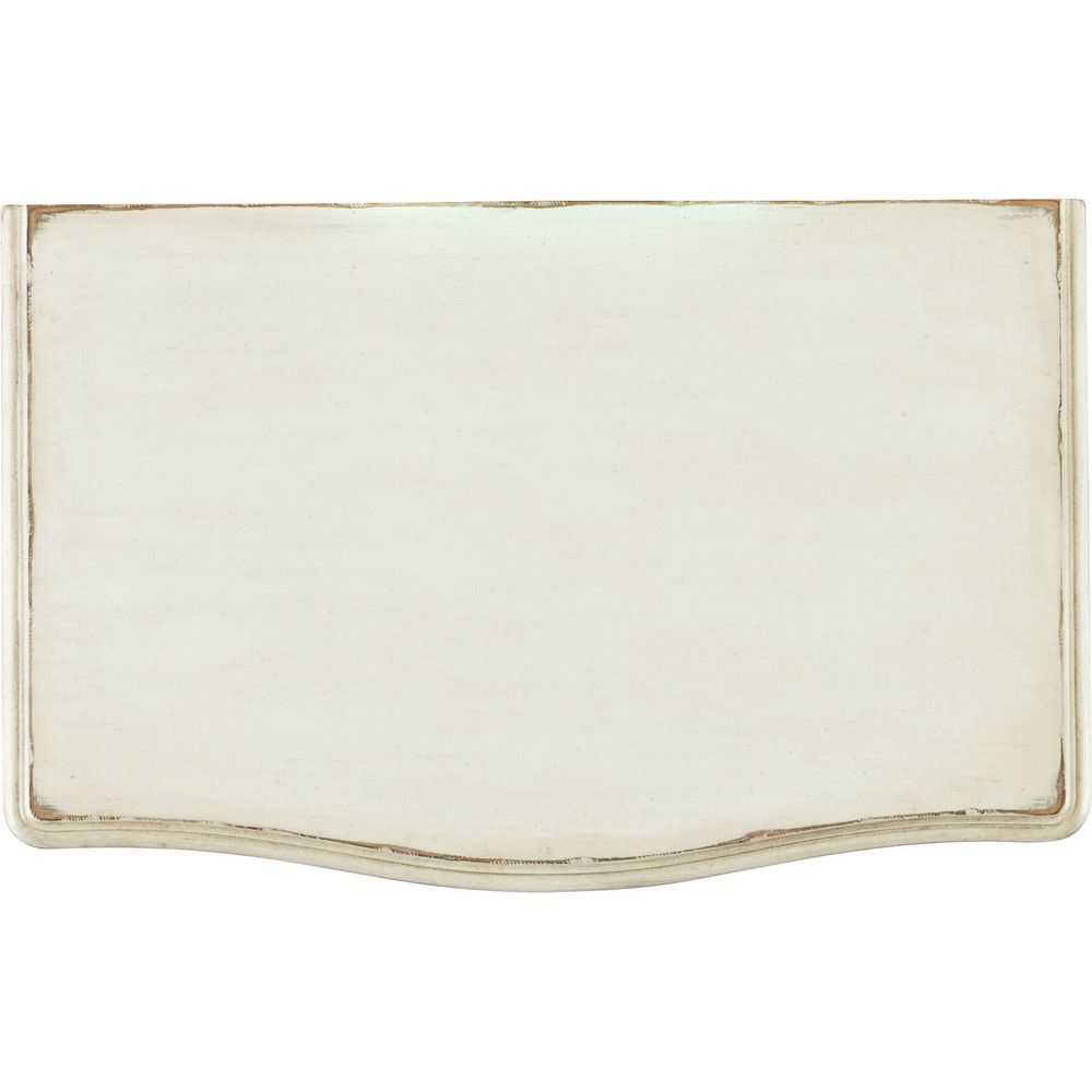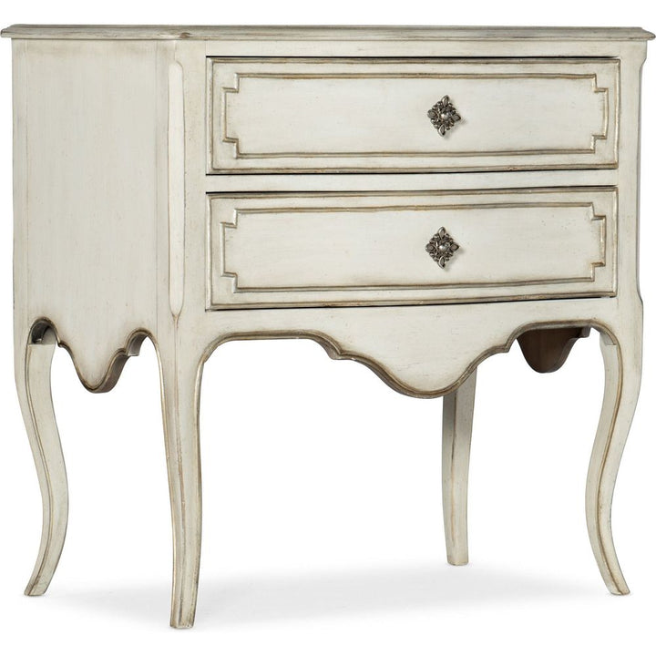 .With shapely legs up to hero, the Coco En Blanc Nightstand is a timeless treasure of delightful design that will help you create a serene bedroom where the stresses of the day melt away. The creamy white finish, shaped apron on the front and sides and cabriole legs create a masterpiece of style. Two drawers. Channeling jet setting socialites from the golden age of Hollywood as its muse, Hooker Furniture is set to launches a major expansion to its popular Sanctuary collection. The bedroom, dining room, occasional and home office pieces are grouped into three unique new personas, each of which embody the influences of the iconic starlets whom left impressions of glamour, charm and class on American pop culture. From bold and dramatic to soft and romantic to a statement-making eclectic lifestyle, the three personas - Collette, Anastasie and Diamant - effortlessly bring to life a well-traveled socialite who has curated a collection of home furnishings in her metropolitan home that tell the story of her travels across the globe. Anastasie offers a softer, romantic look with its creamy white finish that is accented with champagne and silver tipping. Several historical reproduction styled pieces in a two-tone finish are intermingled throughout, giving the group a bit of a traditional European cottage style. Additional design details include table tops with intricate quatrefoil veneer patterns crafted with oak and a mix of unique walnut inlay, carved chairs with acanthus leaf and scrollwork detailing and champagne tipped eglomise.