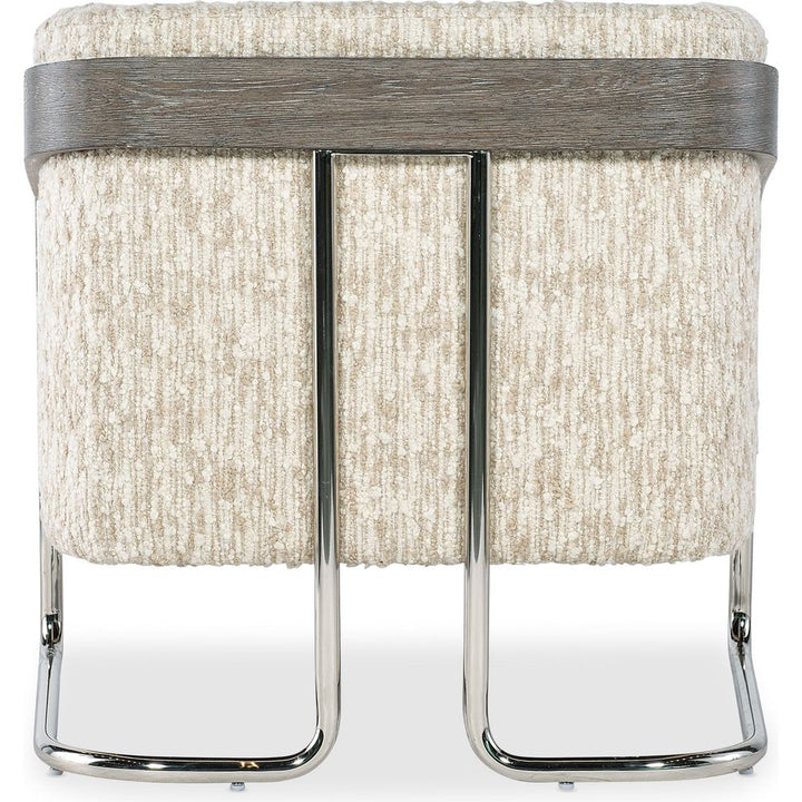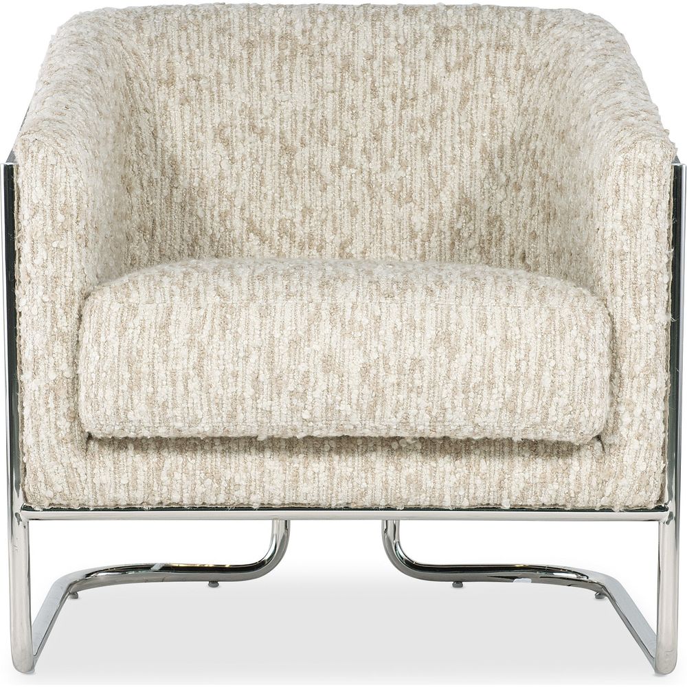 Description: Enhance your living room with the Cody Chair from Hooker Upholstery. This arm chair blends transitional style with comfort, featuring a modern barrel back design and chic topstitch trim. Crafted from quality materials including a chrome metal frame and plush upholstery in Fluffy Natural fabric, it offers both style and durability. Perfect for those seeking a sophisticated addition to their home.