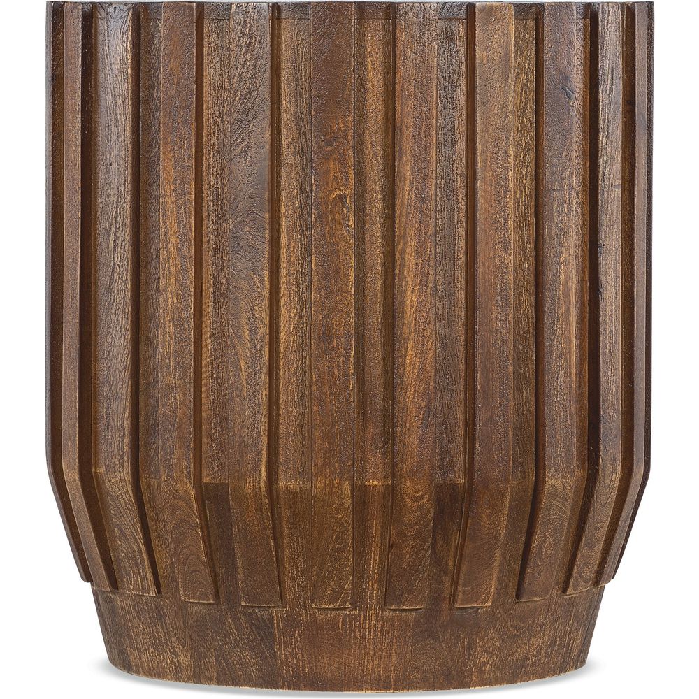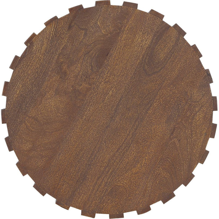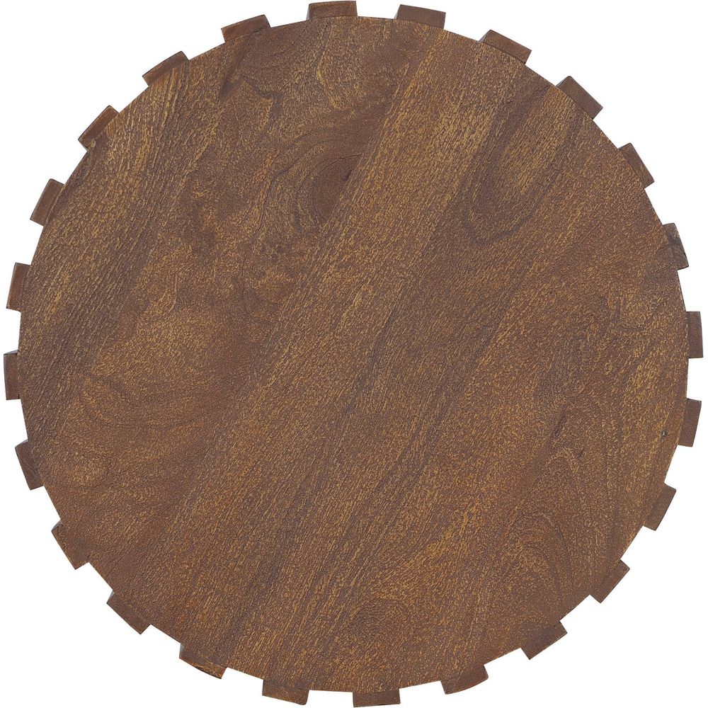 Description: Industrial meets organic in the 22-inch round Gears End Table, crafted of Mango Solids in a natural medium wood finish in a ribbed design in a gear motif.