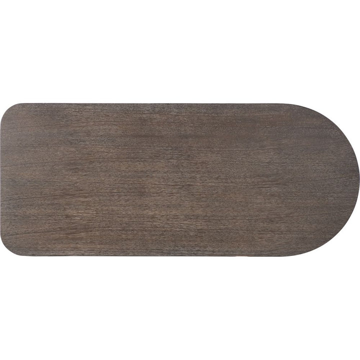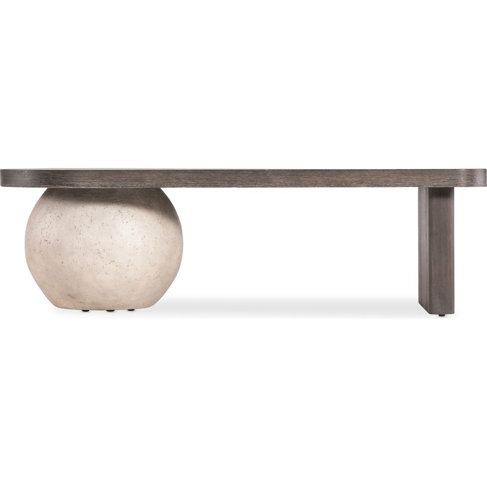 Description: With the aesthetic of an artistic sculpture, the Gibbons Cocktail Bench pairs a pedestal leg with a round ball base in a neutral color palette. Crafted of Oak Solids and Oak Veneers with resin, it has a dark Oak finish with a cream-colored contrasting ball base.