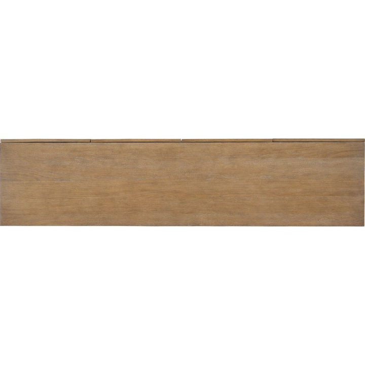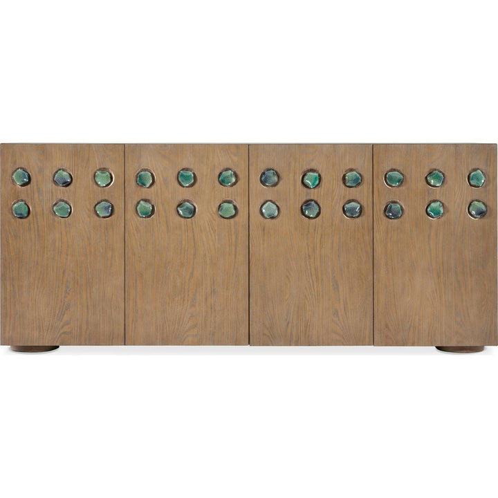Description: Whimsical and organic, the Pilea Entertainment Center is crafted of Oak Solids and Veneers with a light natural finish accented by inset green ceramic pulls in a lily pad design. Measuring 80 inches wide by 18 inches deep, it has four doors with soft-close hinges and touch latches. There's one adjustable wood shelf behind each left and right door and one adjustable shelf behind the center pair of doors. Features wire management and a ventilated back panel behind all doors.