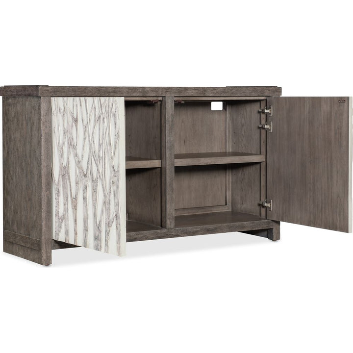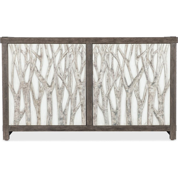 Description: Bring the beauty of nature into your home with the Aspen Grove Door Chest, featuring a raised tree-and-branch motif on a contrasting white background on the door fronts. The chest is crafted of Oak Veneers and Resin with a dark wood finish that contrasts with the branch motif on the door fronts. The two doors have soft-close hinges and magnetic catches. There's one adjustable shelf behind each door. The interior finish matches the exterior.