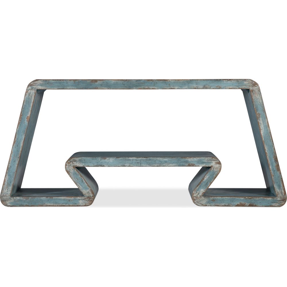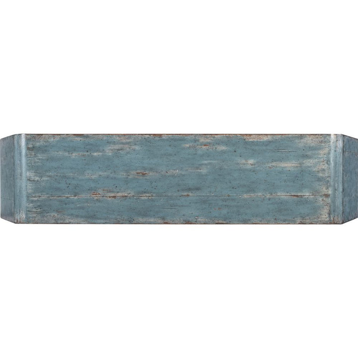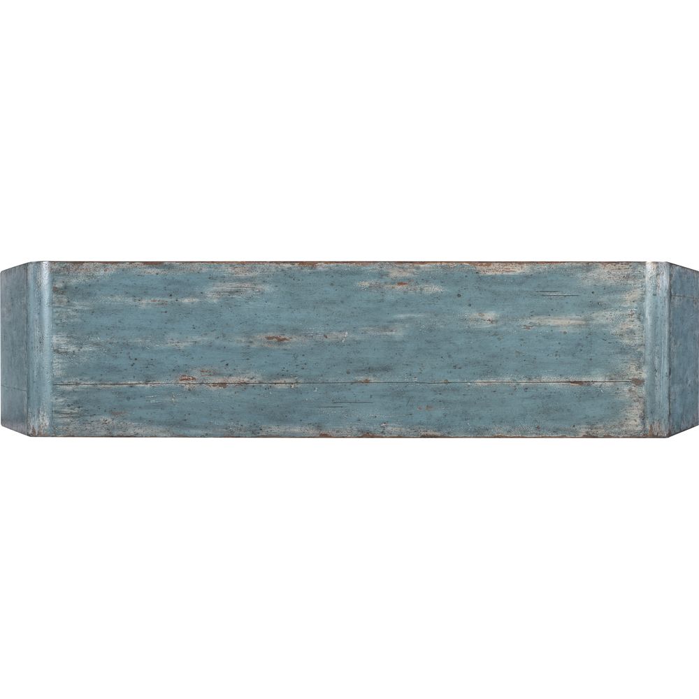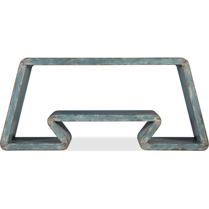 Description: With its artistic shape, the Inside Track Console Table is an intriguing statement piece. Featuring a narrow, rectangle form, it has a trapezoid shape with a raised base that creates a shelf. Crafted of Maple Veneers, the heavily distressed blue finish gives a casual vibe suited for interiors from coastal to cottage to Bohemian.