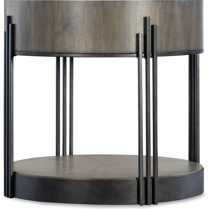 Description: Chic industrial gets an Art Deco influence in the 26-inch round Skyline Side Table. The eclectic piece combines Acacia Wood with Sheet Metal and Metal Tube, accented by a stunning starburst veneer pattern on the top surface. The table is finished in dark natural wood with dark bronze metal banding and legs.