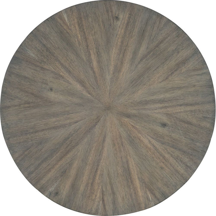 Features: Round shape; Metal legs and banding around bottom; Base creates open area; Starburst veneer pattern on top