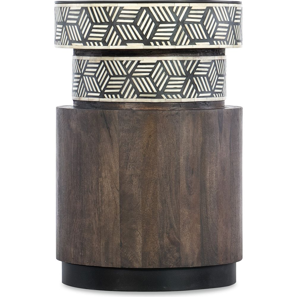 Description: Exotic, eclectic and earthy, the Vector Side Table is crafted of Mango Solids and Iron with Bone Inlay on the top two sections. Featuring a round shape and stepped design, it has a natural dark wood finish with black and white bone inlay on the top two sections with a black top.