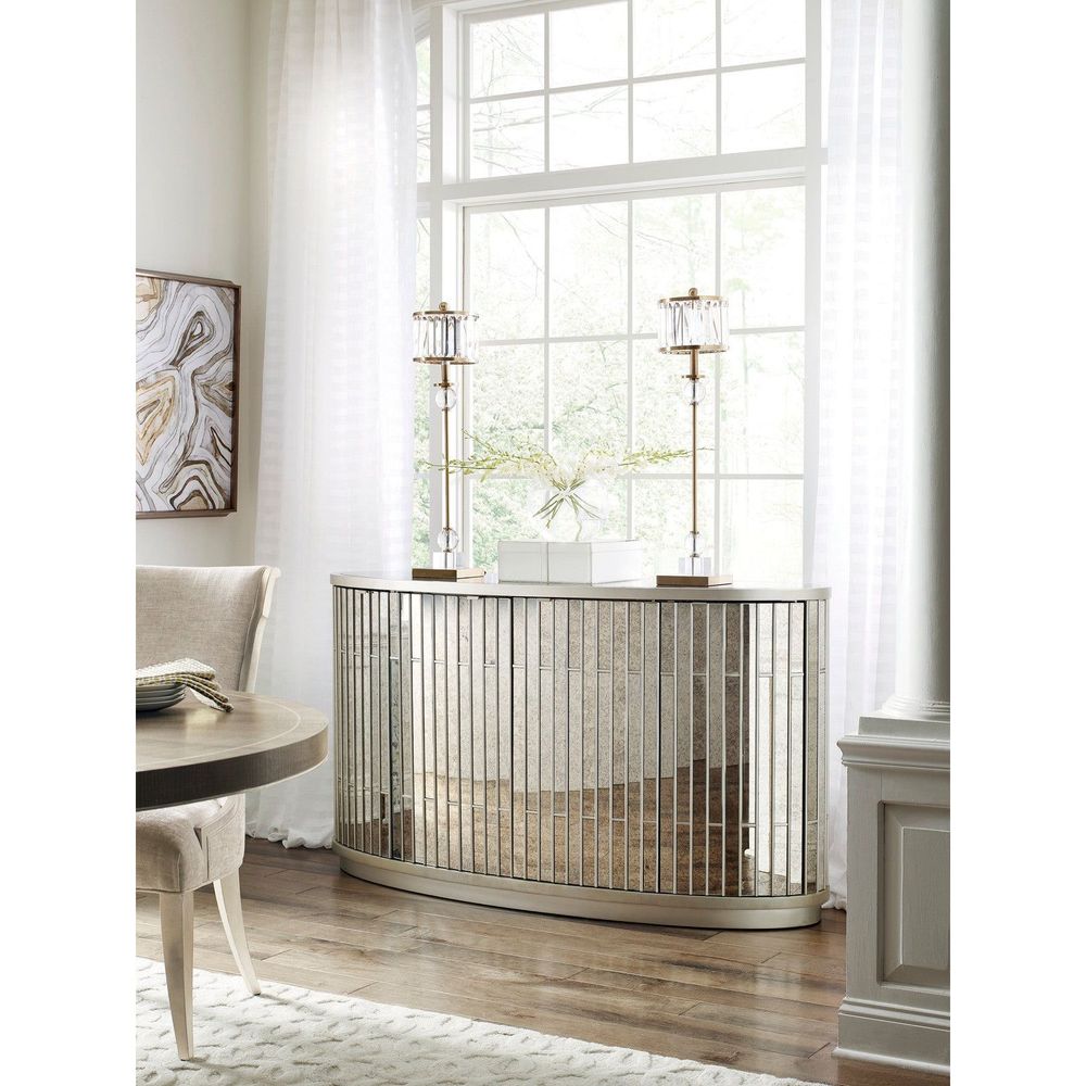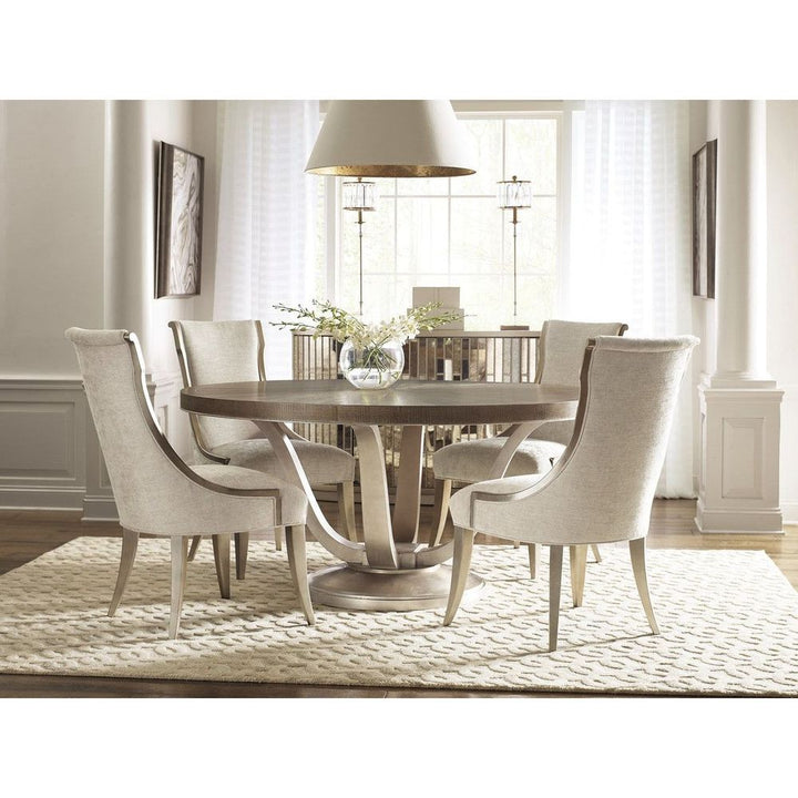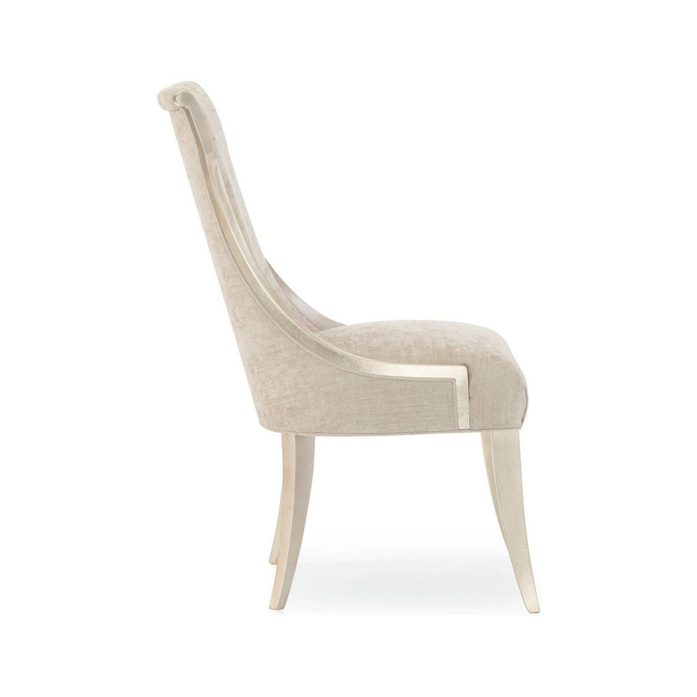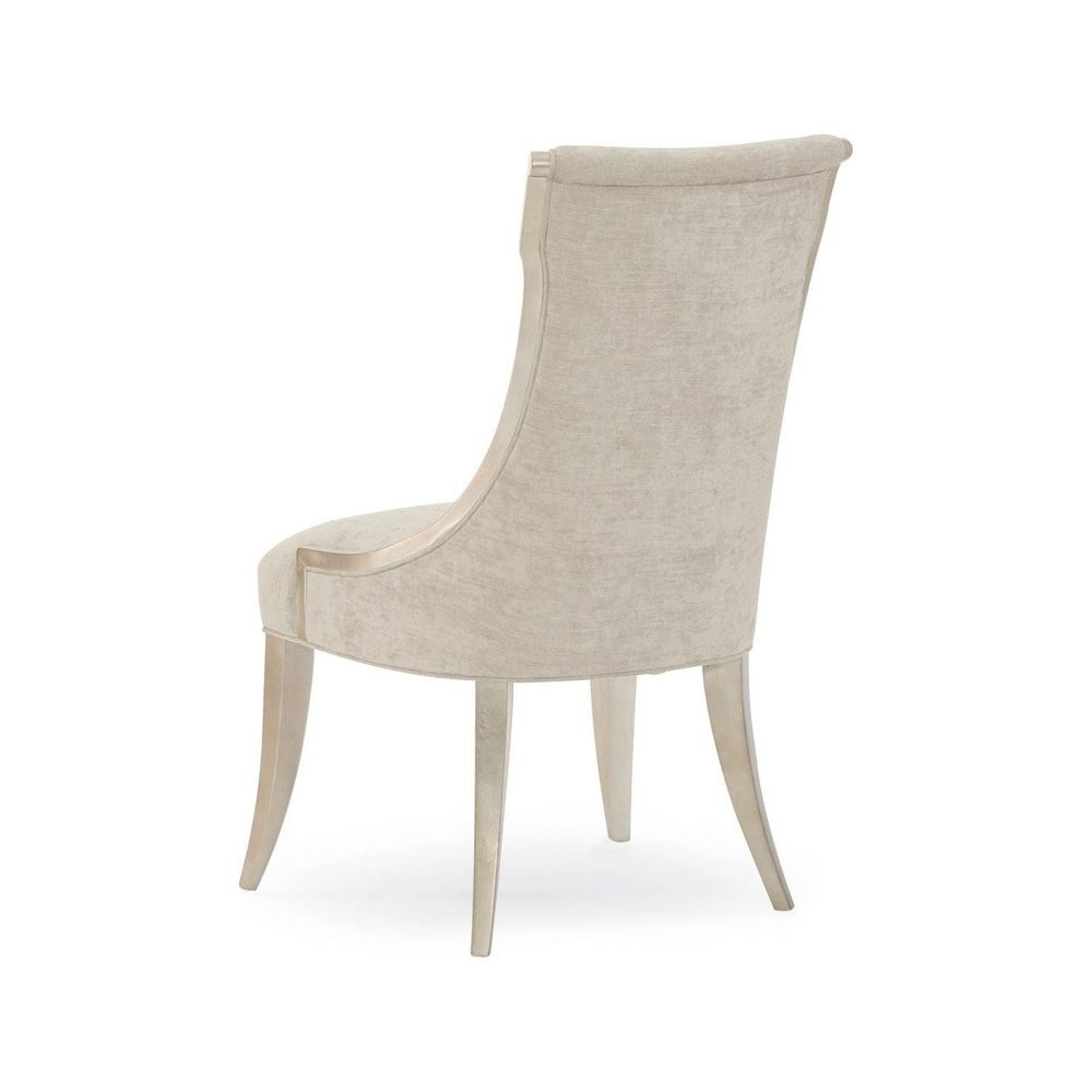 This upholstered dining chair has true stately elegance. Shimmering pearlescent fabric wraps the back, front and tight seat in supreme comfort. An exposed wood frame completed with Soft Silver Leaf gently curves around the back. The piece is finished with thin tapered sabre legs.