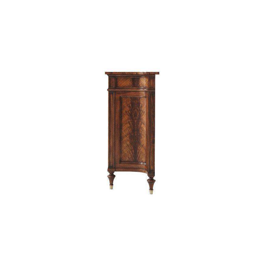 A fine mahogany, flame veneered and burl banded side cabinet, with three frieze drawers above corresponding oval panel and lozenge inlaid doors enclosing adjustable shelves, with concave sides, on turned legs with brass cappings.