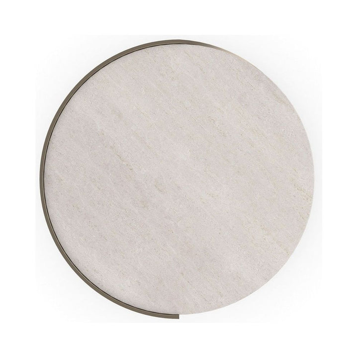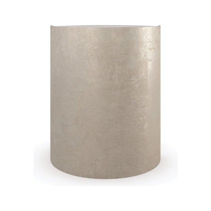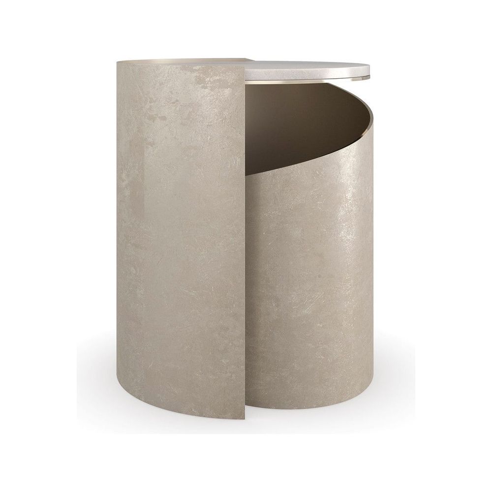 Inspired by the elegant spiral found in a nautilus shell, this spot table is topped with creme travertine, seemingly suspended above a graceful metal curve finished in Taupe Silverleaf. A Whisper of Gold adds a hint of glamour to its overall soft patina. Perfectly proportioned for holding a beverage or book.
