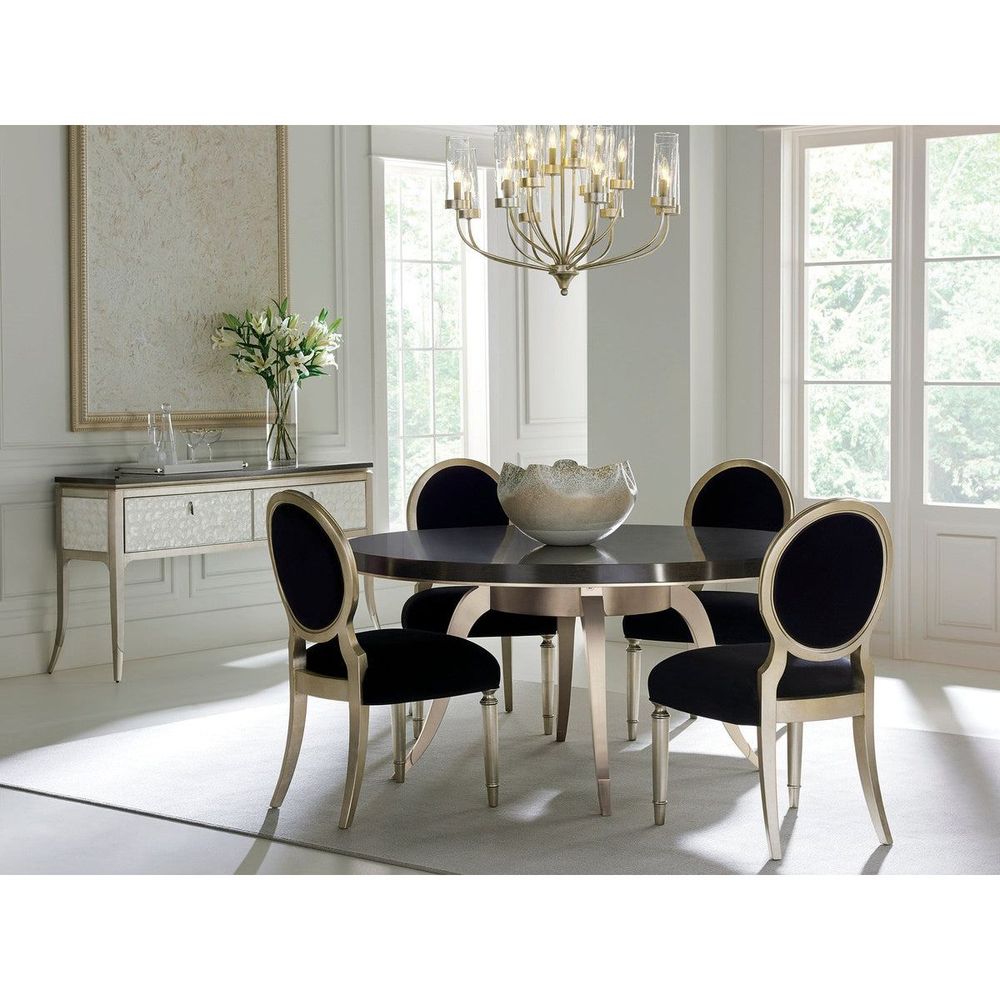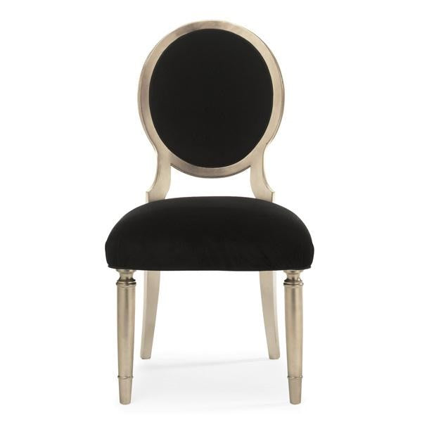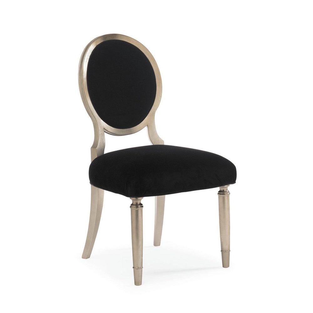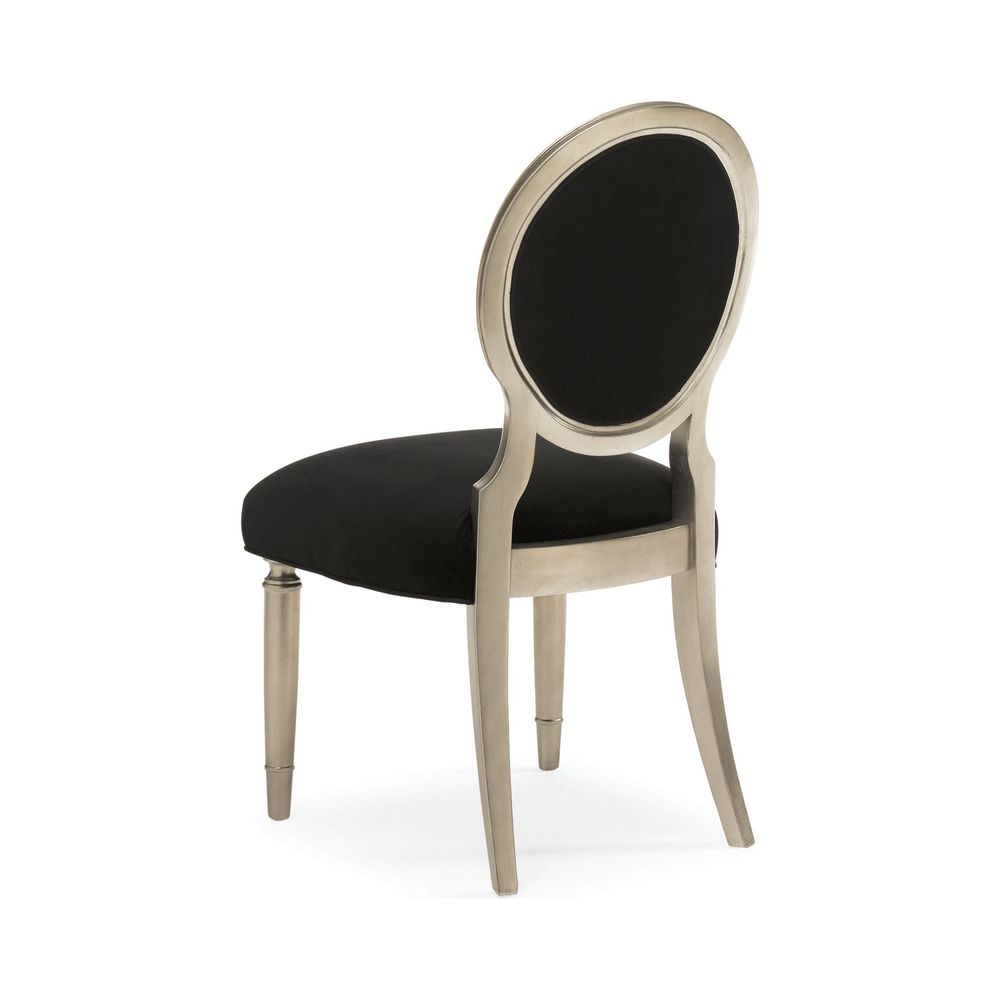The Chit-Chat arm and side chairs are an elegant dining companion. Nicely scaled with an oval-back, this chair will always be a classic. We eliminated the expected carvings to give this chair a fresher attitude for today's interiors. Finished in a warm, Taupe Silver Leaf, these chairs are upholstered in black velvet. Is there anything more chic? We think not!
