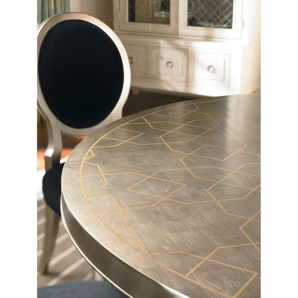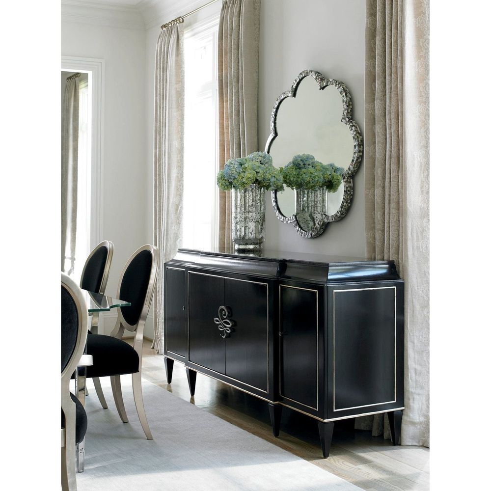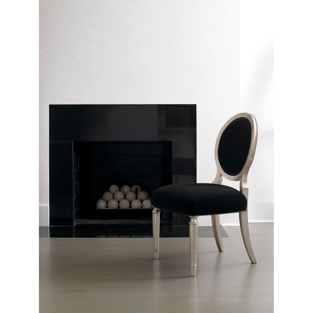 The Chit-Chat arm and side chairs are an elegant dining companion. Nicely scaled with an oval-back, this chair will always be a classic. We eliminated the expected carvings to give this chair a fresher attitude for today's interiors. Finished in a warm, Taupe Silver Leaf, these chairs are upholstered in black velvet. Is there anything more chic? We think not!