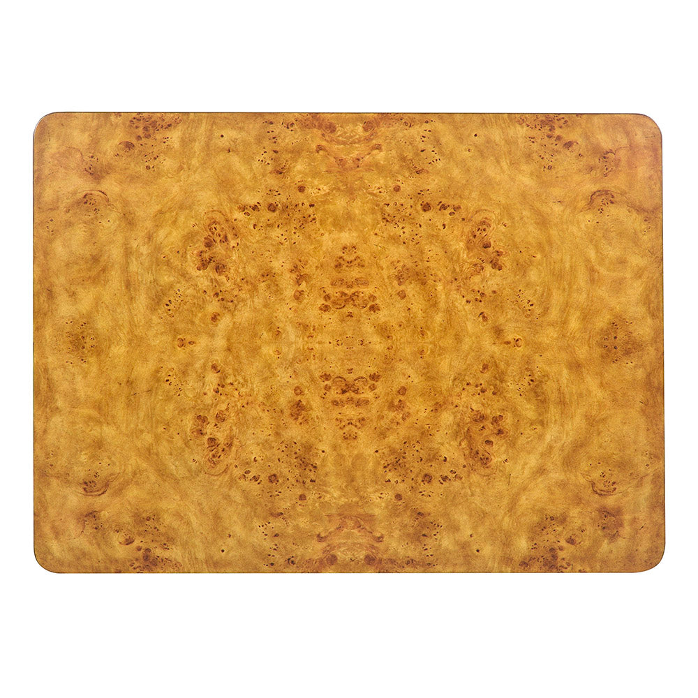 Description: Our Cordova Coffee Table features a smooth, rounded-edge top and legs, open shelving, and a delicate brass detail; Rustic finish on Mappa Burl veneer.