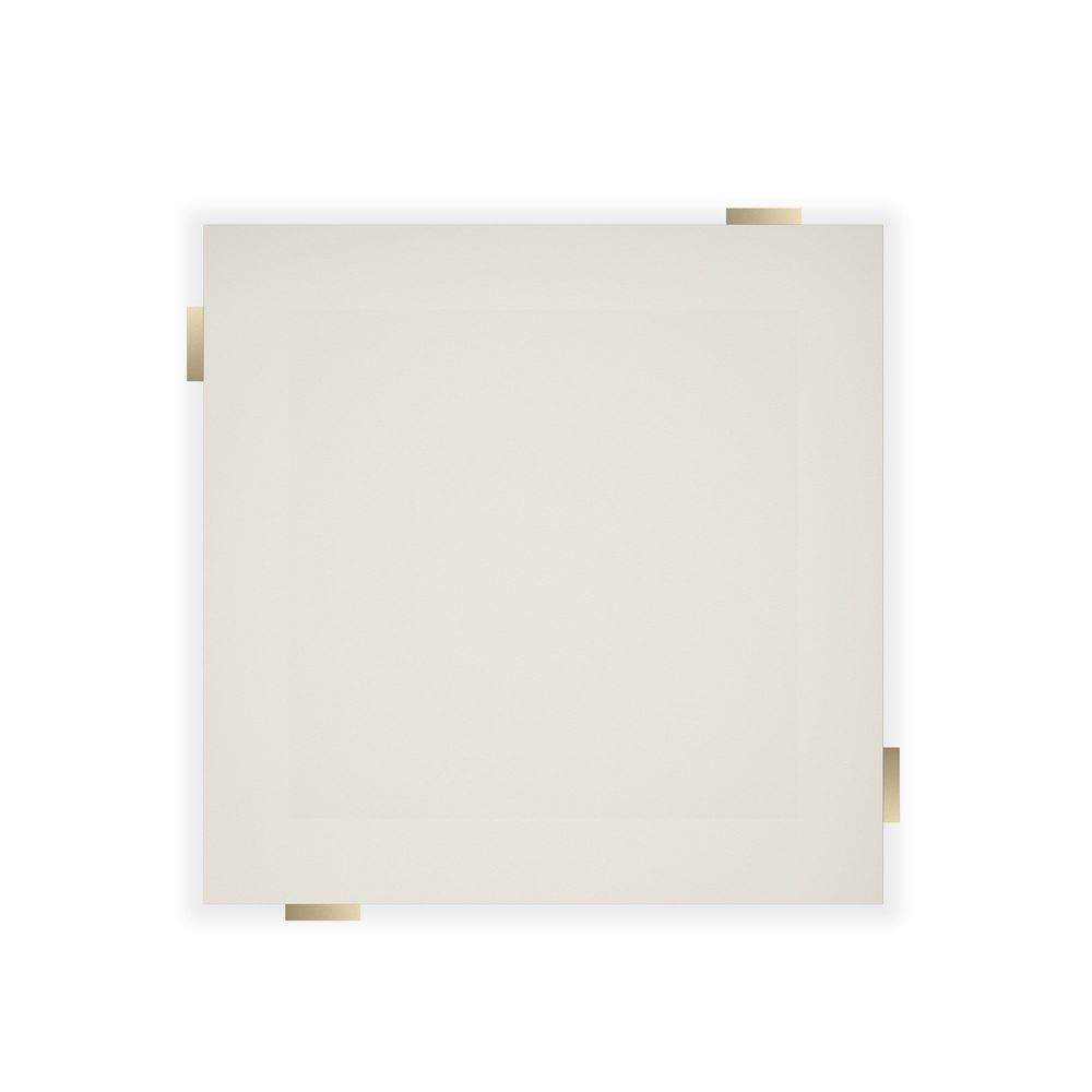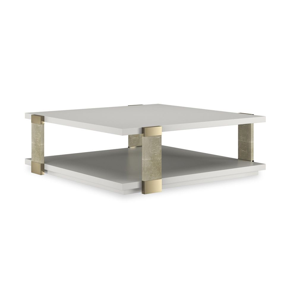 This square coffee table presents a beautiful balance of linear forms and light. Its Almond Milk tabletop and shelf appear to float within Oracle hand-applied leaf wood posts. Whisper of Gold metal accents trim the top and bottom of each post, adding a dressed up touch to this piece.