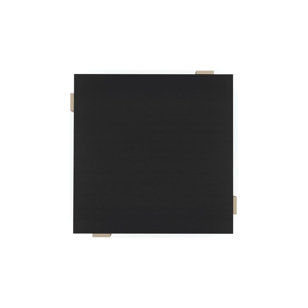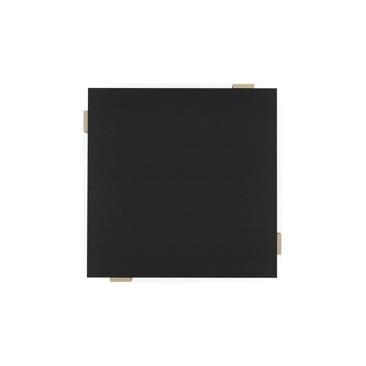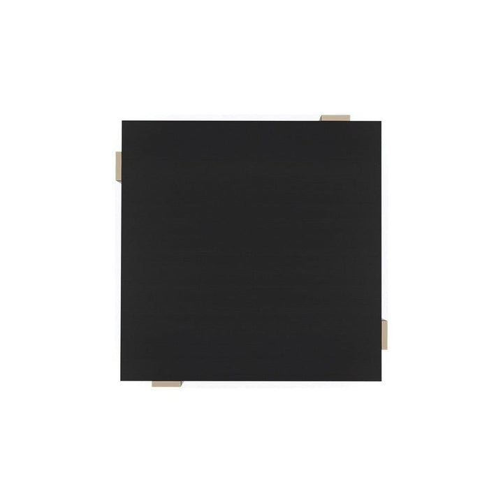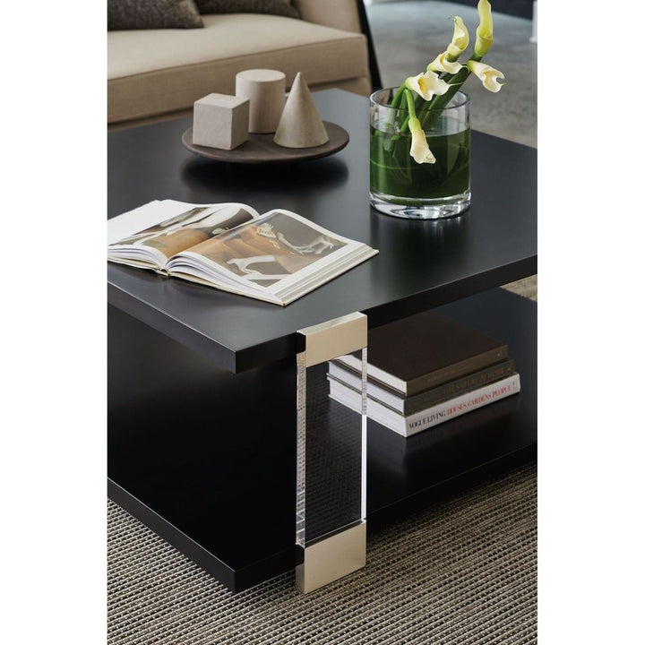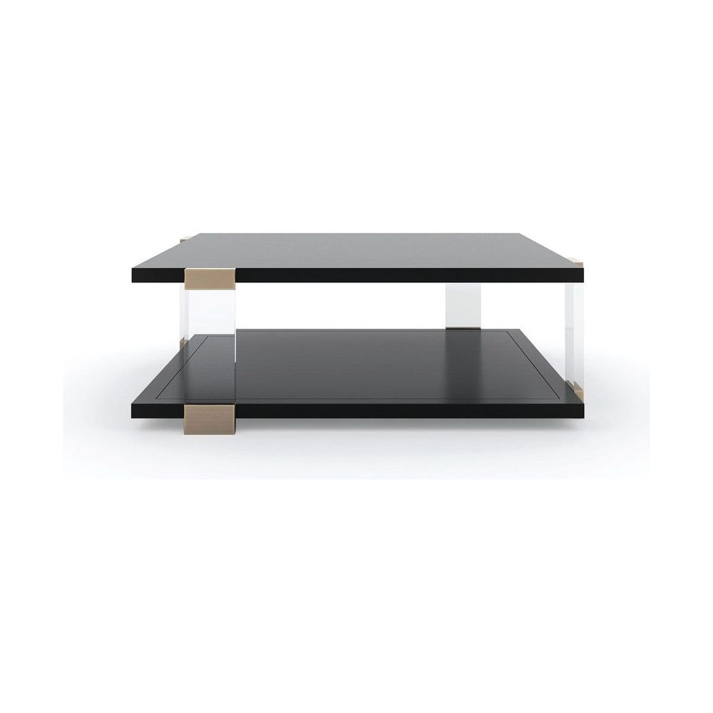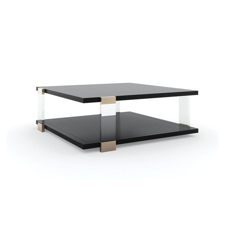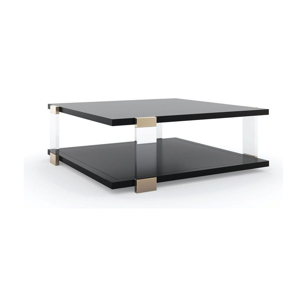 Instantly elevating, this square cocktail table brings a beautiful balance of linear forms and light. Its Tuxedo Black tabletop and shelf appear to float within clear acrylic posts, for a look that stirs interest, without imposing. Whisper of Gold metal accents create shimmer and moments for reflection. Centers a room, and offers ample space to style books and decor, above and beneath.