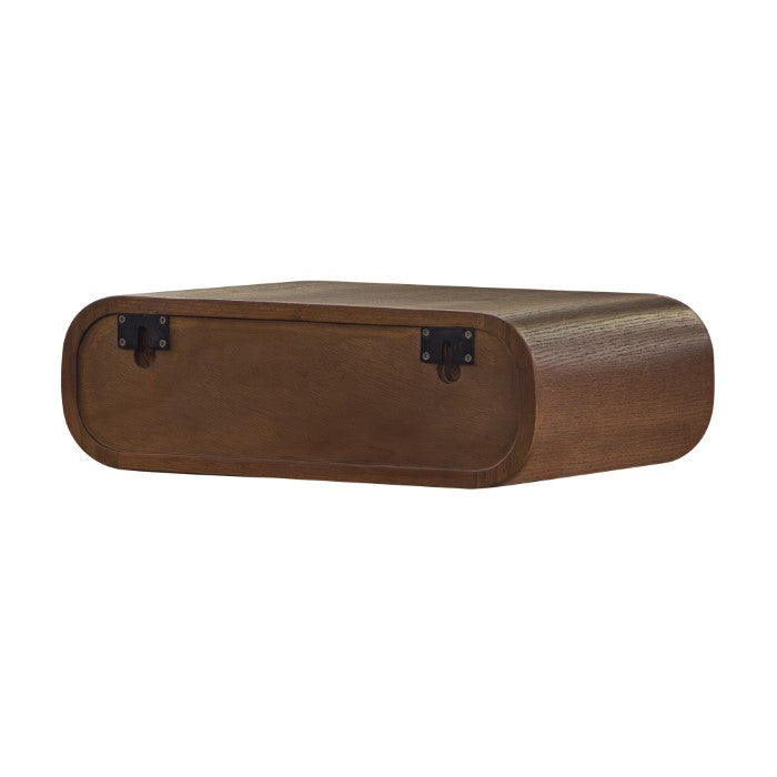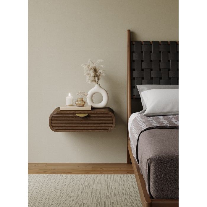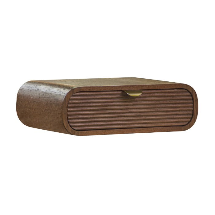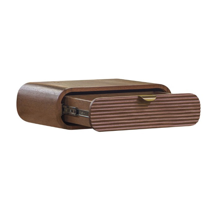 Description: Designed for small spaces, the Corrin wall mounted nightstand frees up valuable floor space. A veneered case supports a profiled, solid wood drawer with mortised brass pull hardware.