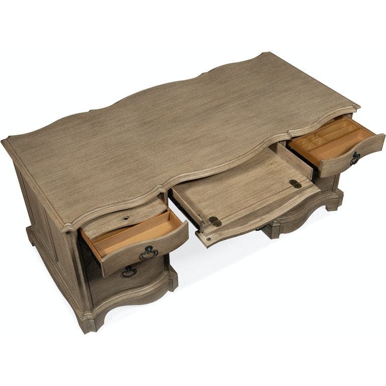 With a casual attitude and a sun-washed ambience inspired by the Mediterranean island for which it is named, the Corsica Executive Desk is crafted of Acacia Veneers with a wire-brushed, artisan light natural finish with reclaimed character. Stylish details include a scallop-like carved base and shaped ring pulls in a burnished bronze finish. Seven drawers, including 2 top drawers on each side containing removable divider inserts. There's one removable writing slide and one removable pencil drop-in that can be used in either top drawer. The bottom two drawers on each side are locking file drawers and contain pendaflex letter/legal filing systems. A drop-front drawer for keyboard use. The Work Your Way program focuses on the new reality many consumers face as they continue to do much of their work from their homes. Available in five design styles, the program offers an assortment of key home office pieces for a variety of spaces - whether a dedicated executive home office or a more casual workstation. Ranging in scale and functionality, all of the groups within Work Your Way include an executive desk, a junior executive desk, a writing table, a lateral file, a credenza and hutch and a bookcase.